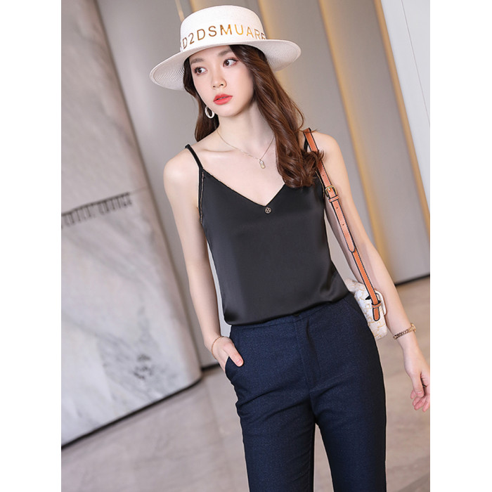 白色吊帶衫女夏天v領醋酸緞面上衣搭配西裝背心西服內搭打底衫