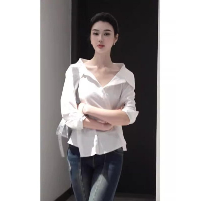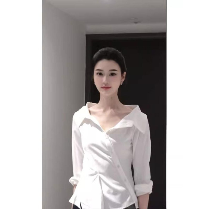 Rixo Kelly斜邊釦露肩長袖襯衫新款設計感純欲修身收腰女襯衣上衣