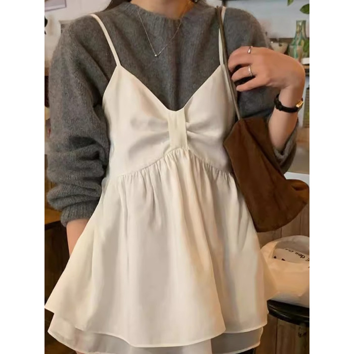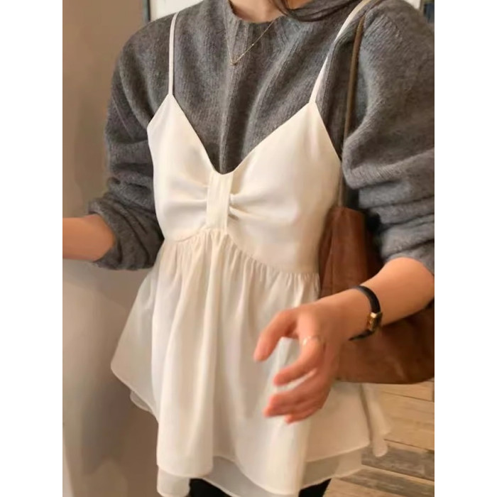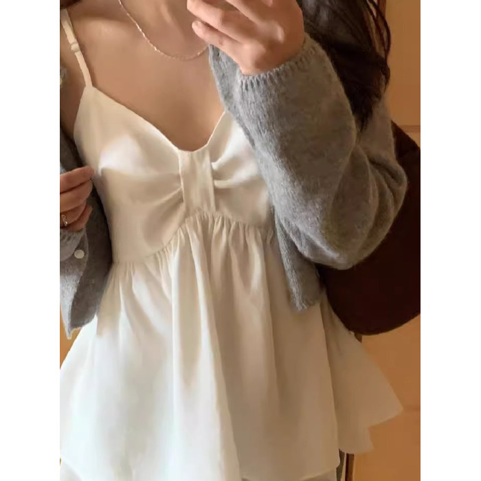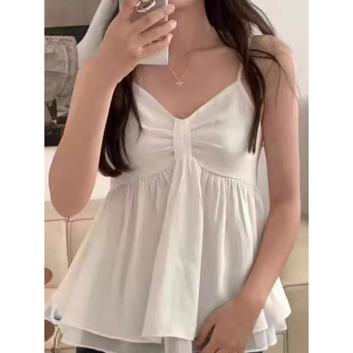 O'Moey ◆荷葉邊雙層吊帶背心百搭V領蝴蝶結氣質顯瘦吊帶衫