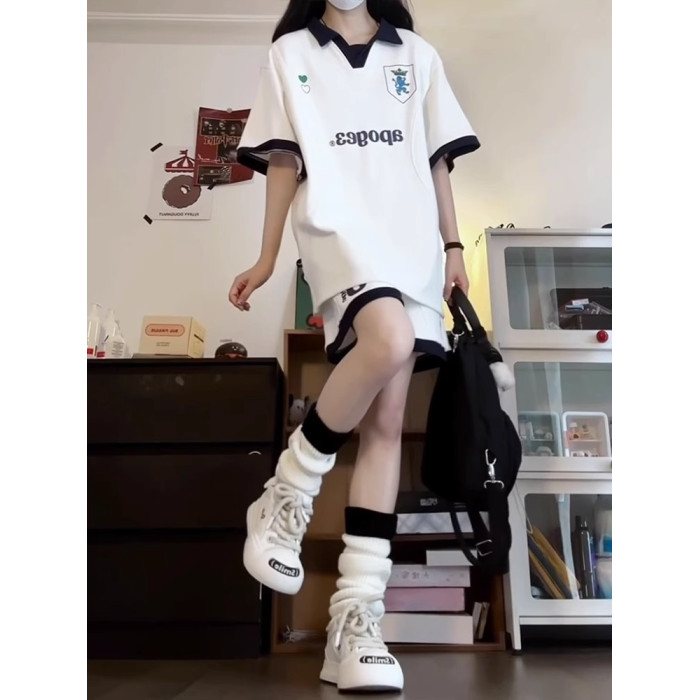英國DGKP學院風運動套裝女2025夏季寬松拼色短袖休閒跑步兩件套
