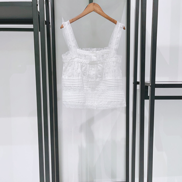 法式小衆 2025早秋新款精美蕾絲拼接短袖系帶收腰棉質上衣吊帶衫