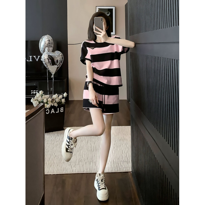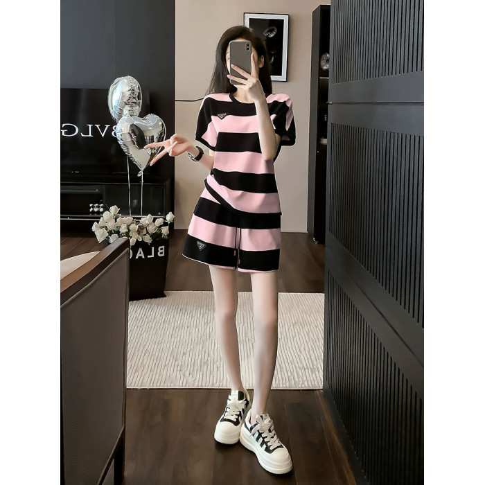 時尚洋氣條紋休閒運動套裝女夏季2025新款短袖韓系高級感兩件套潮