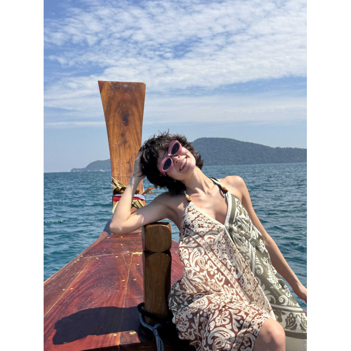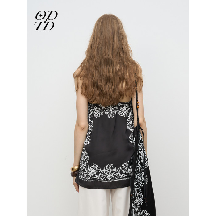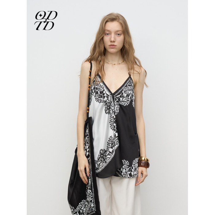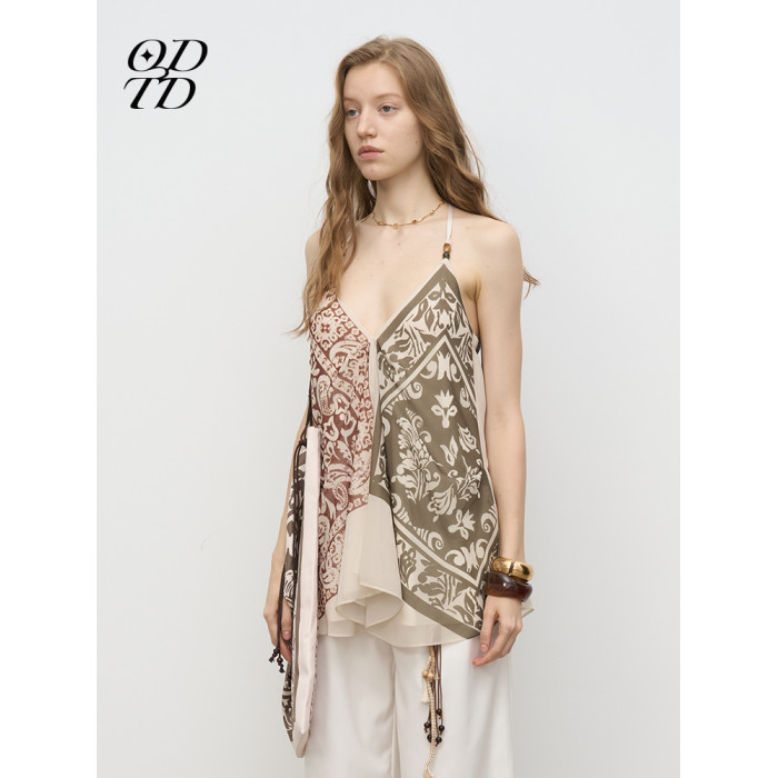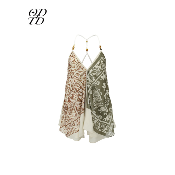 ODTD25春夏新品V領藝術印花撞色串珠吊帶衫波西米亞波嬉風設計款
