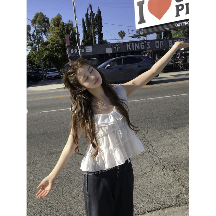 vegettable韓國甜美大圓領荷葉領邊系帶無袖上衣女短襯衫公主小衫