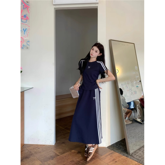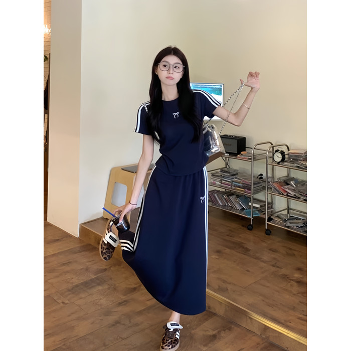 ootd美式運動套裝女夏季藏藍色短袖半身裙學生寬松顯瘦休閒兩件套