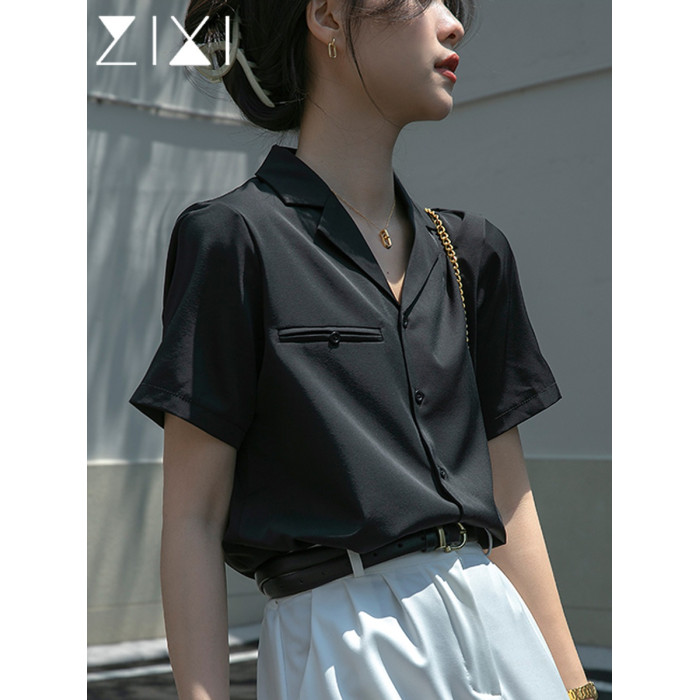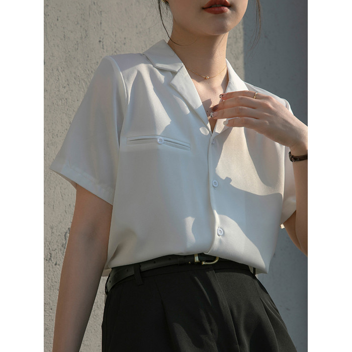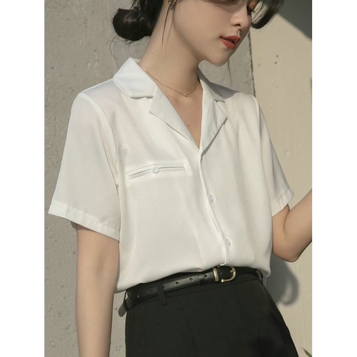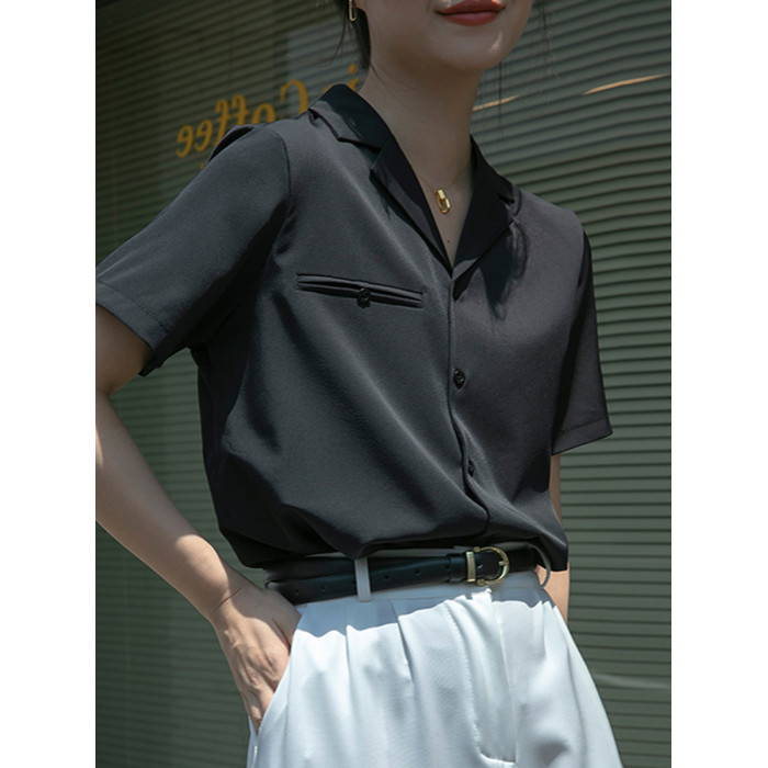 黑色短袖女襯衣夏季西裝領正裝雪紡襯衫職業通勤教資面試上衣薄款