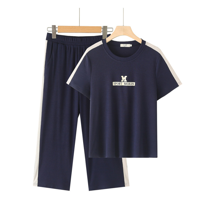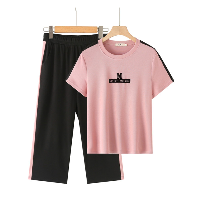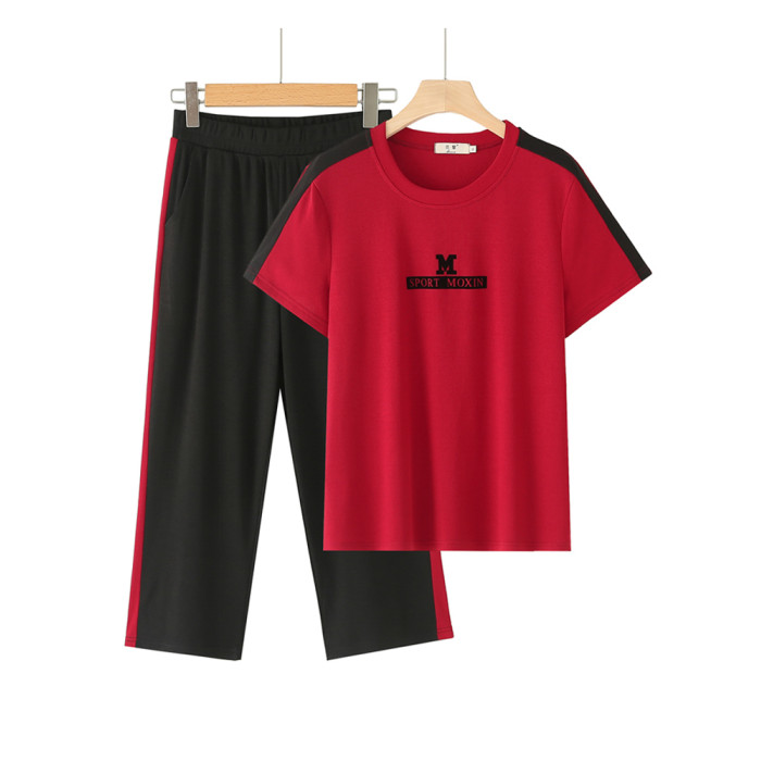 中年女裝運動套裝夏裝新款冰絲媽媽運動服彈力休閒兩件套短袖上衣