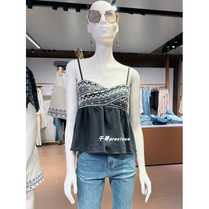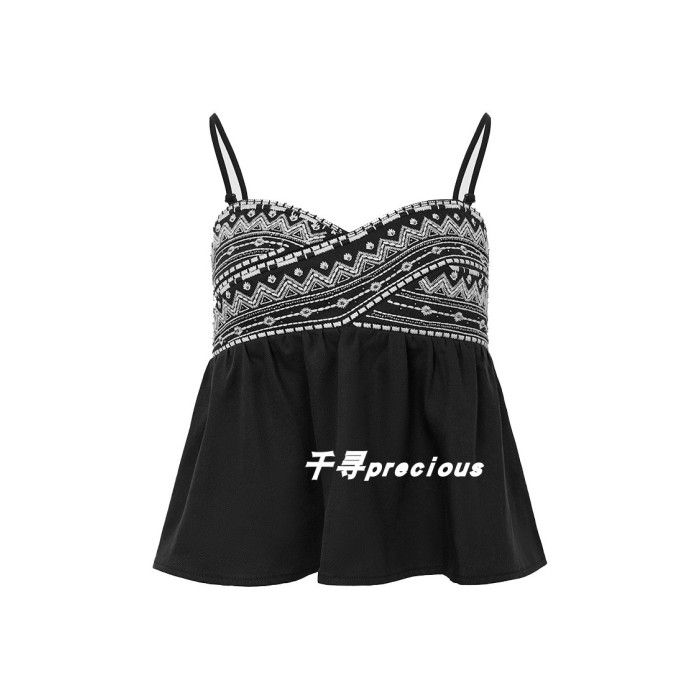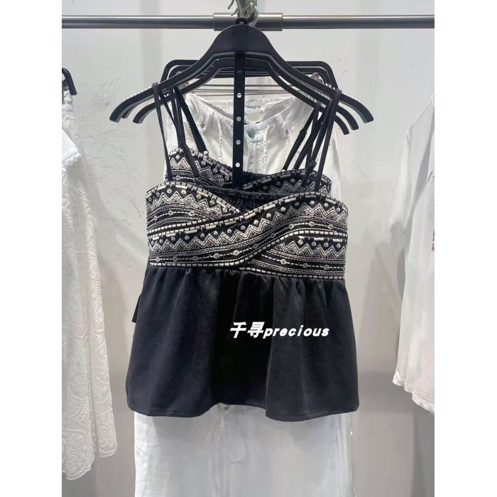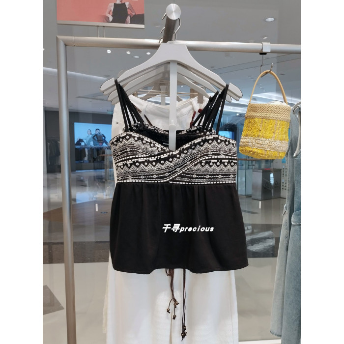 UR&DC黑色無袖吊帶上衣女夏季休閒印花民族風方領刺綉打攬吊帶衫