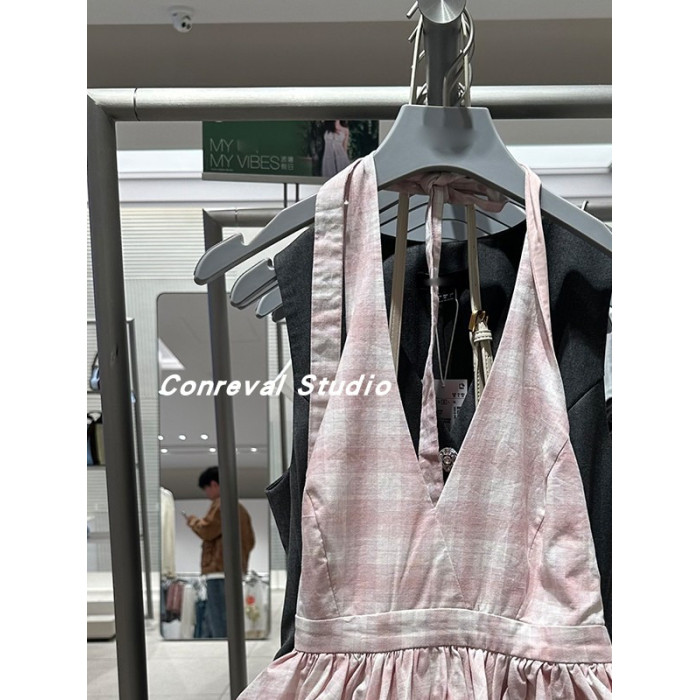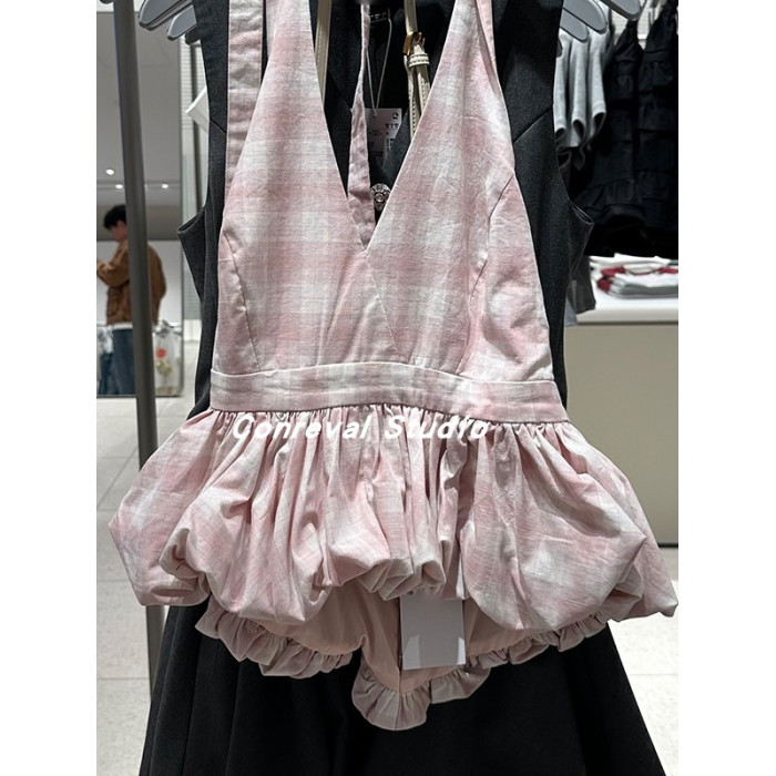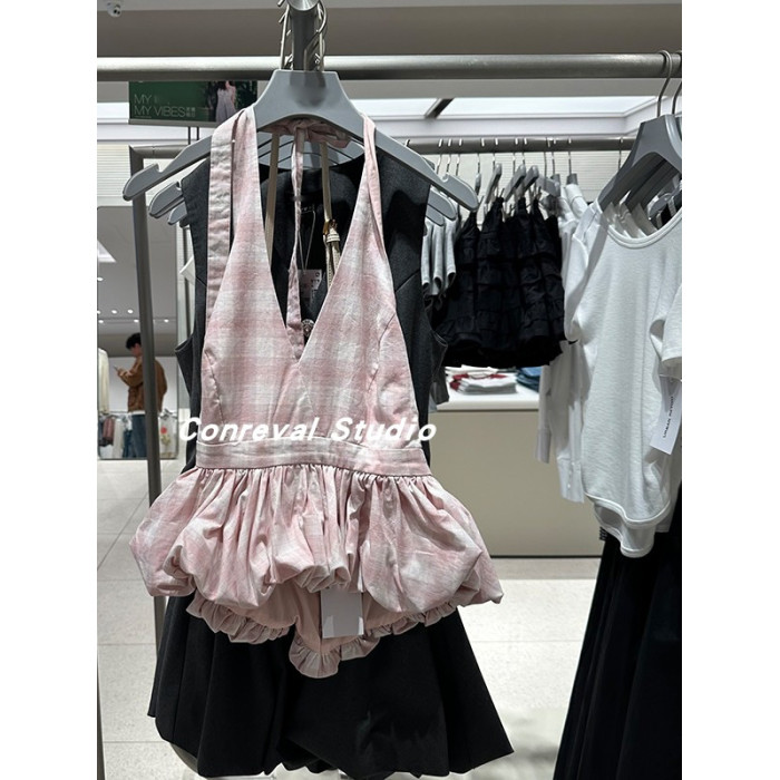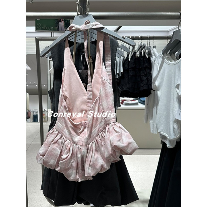 SH&UR2025夏季新款女裝法式甜美格子掛脖露背系帶吊帶衫上衣ins