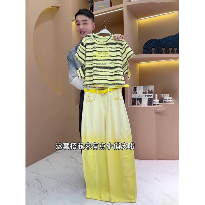 歐貨夏季短袖運動套裝女2025新款時尚洋氣漸變牛仔濶腿褲兩件套潮