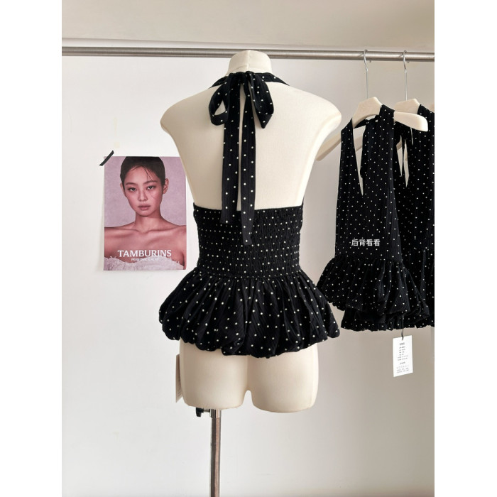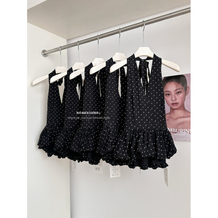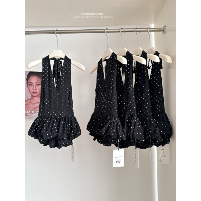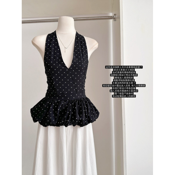 法式波點掛脖系帶露背吊帶衫女2025夏季辣妹小衆收腰顯瘦背心上衣