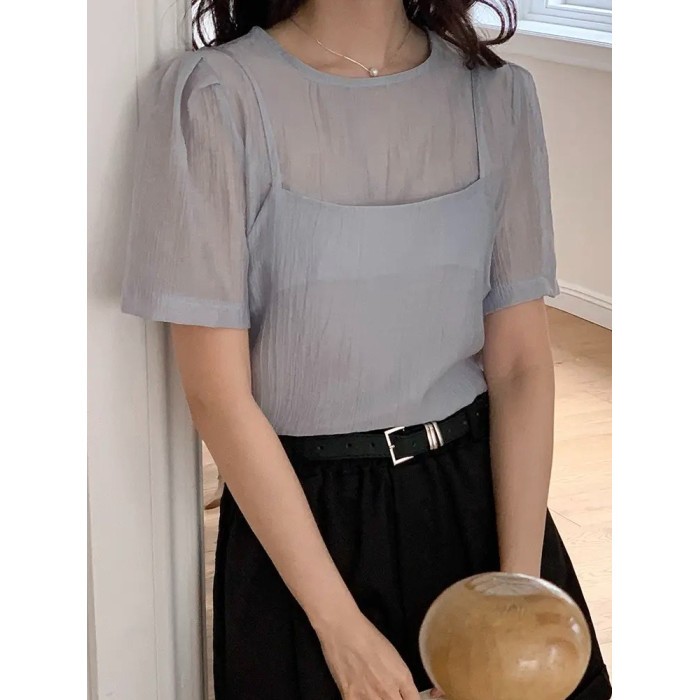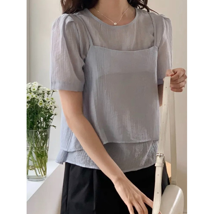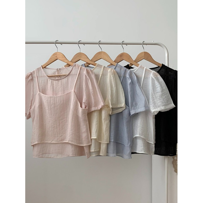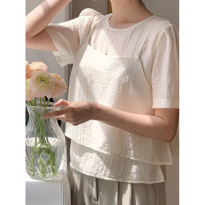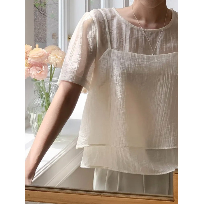 O'Moey ◆chic氣質紋理感微透短袖襯衫+曡穿吊帶衫兩件套
