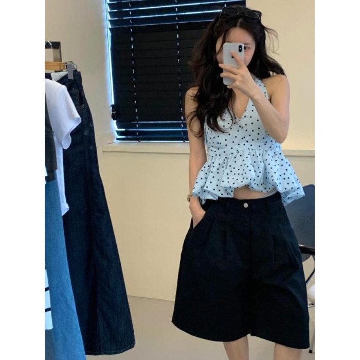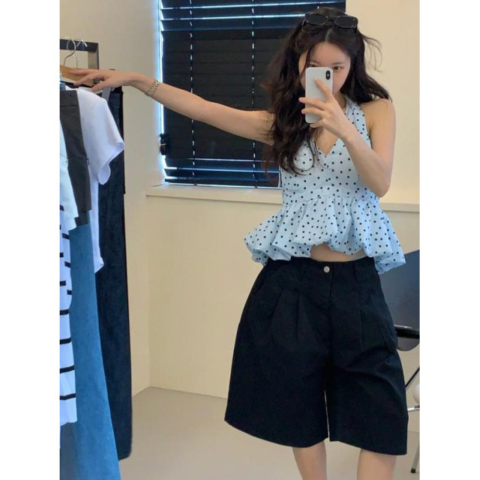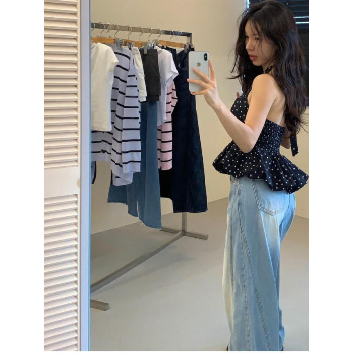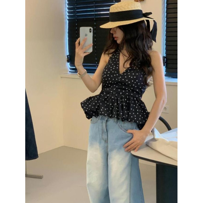 韓國波點掛脖露背吊帶衫女夏季法式v領性感顯瘦花苞設計背心上衣