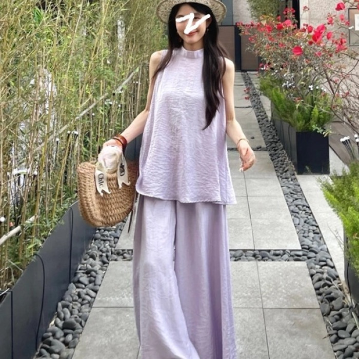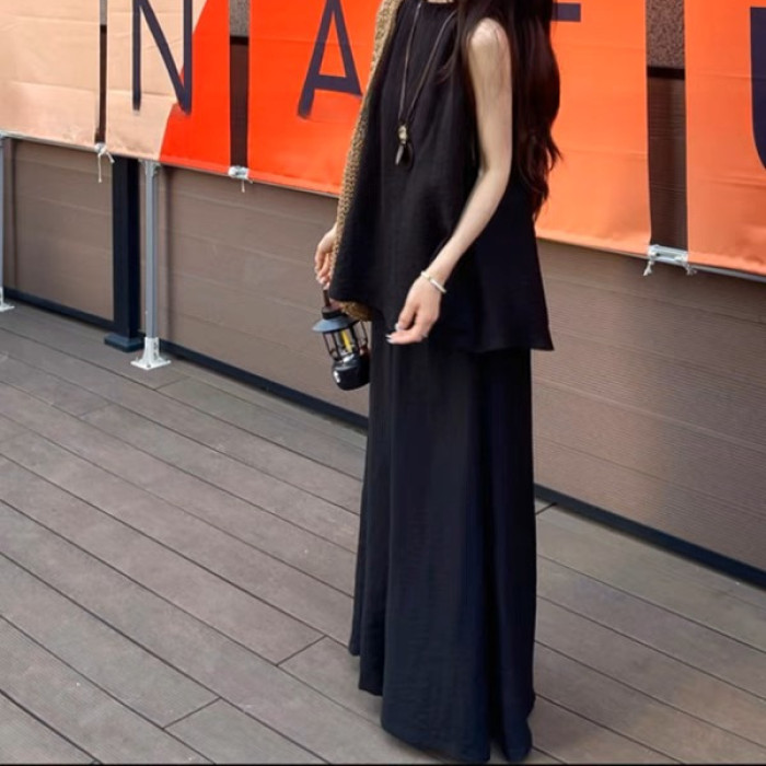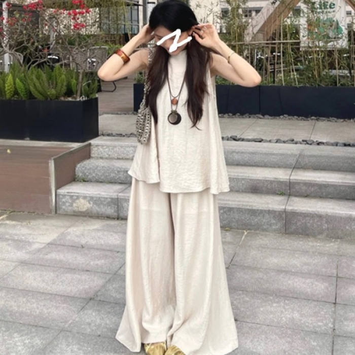 棉麻休閒時尚寬松運動套裝女夏季無袖背心濶腿褲遮肚藏肉兩件套潮