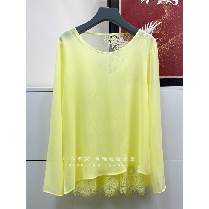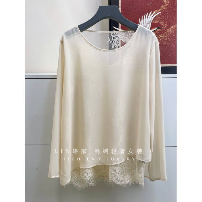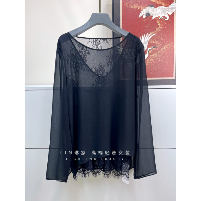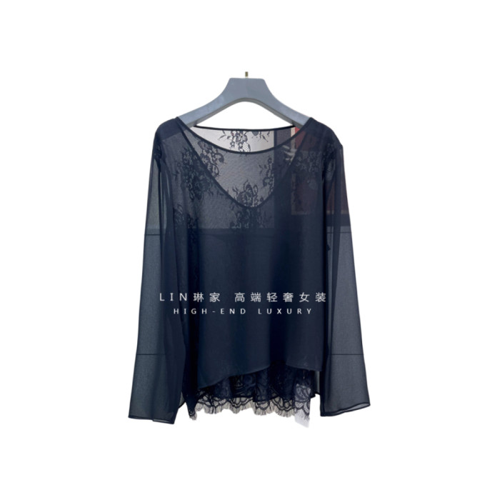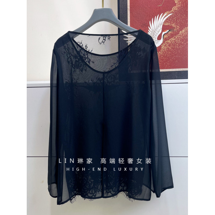 高級感透視薄款蕾絲拼接長袖喬其紗上衣開衫防曬衣女襯衣外搭罩衫
