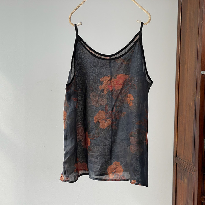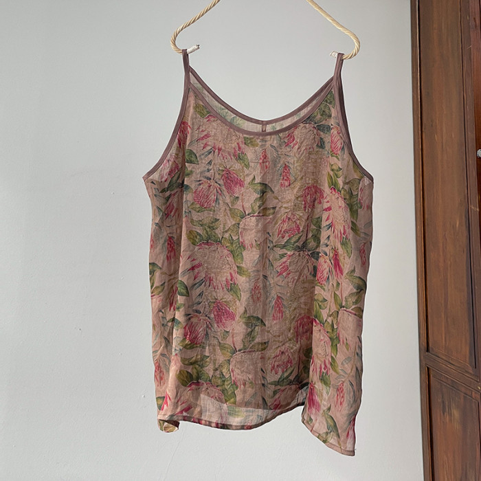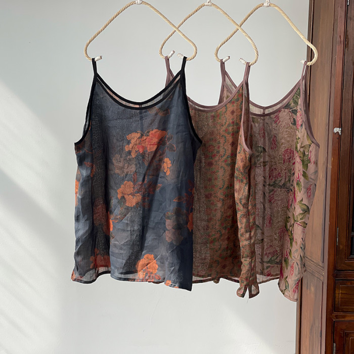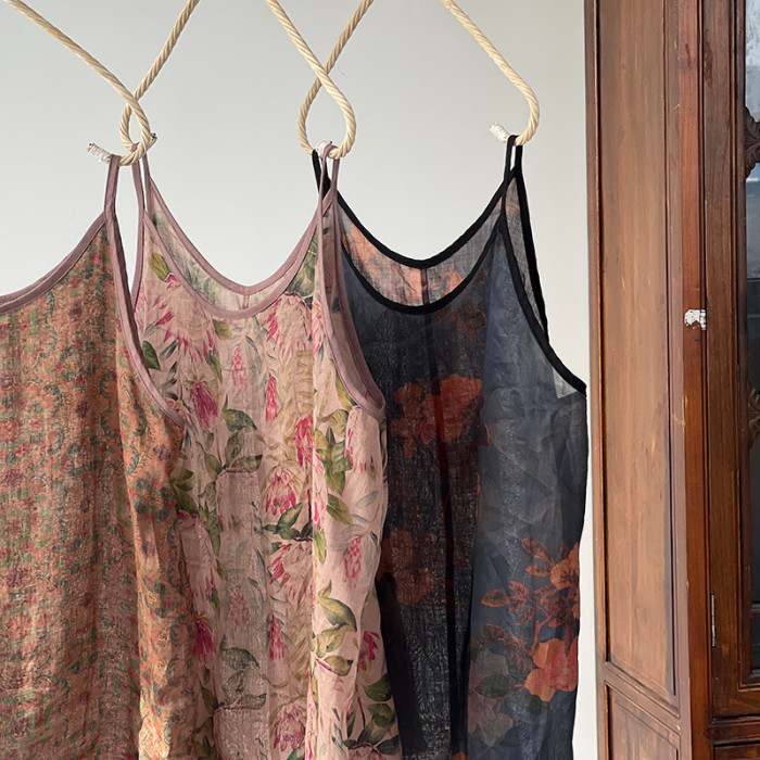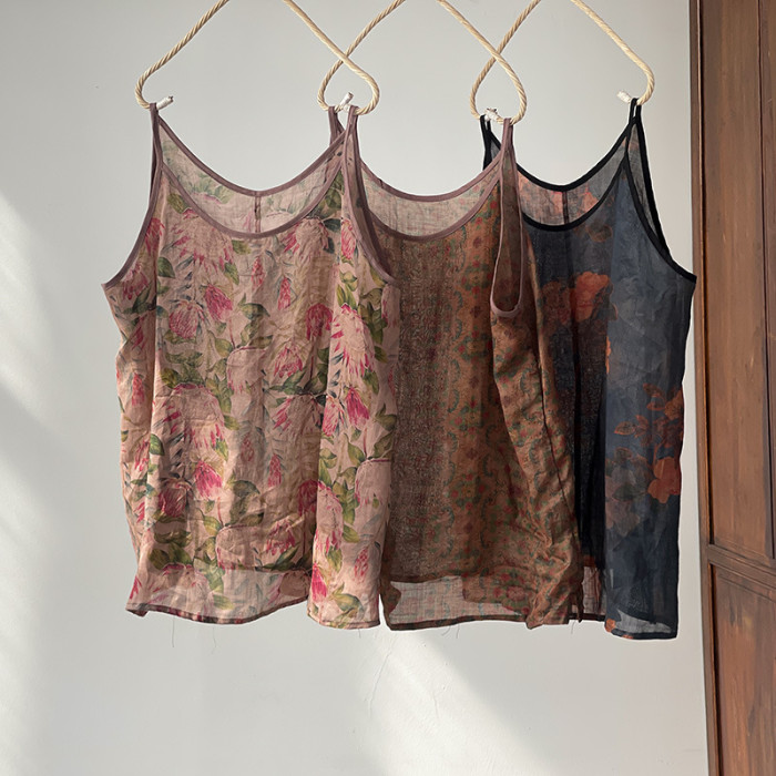 夏季印花薄款細苧麻文藝復古上衣女 原創寬松大碼外穿內搭吊帶衫