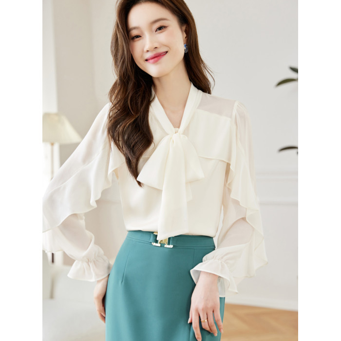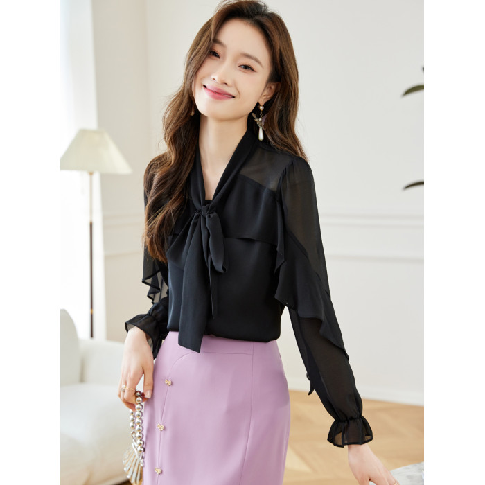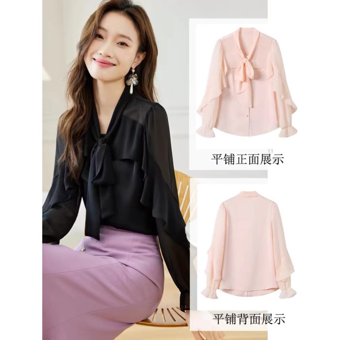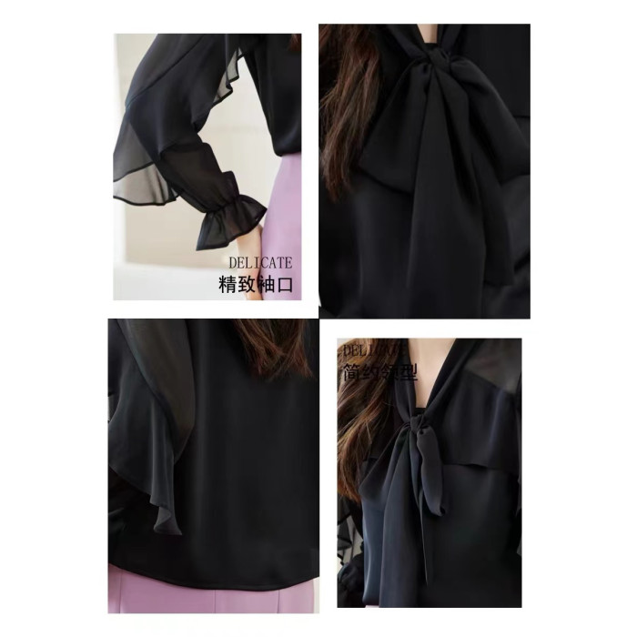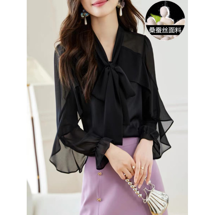 蝴蝶結真絲襯衫女高級感2024年春裝新款黑色V領桑蠶絲女襯衣上衣