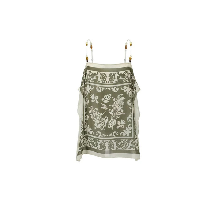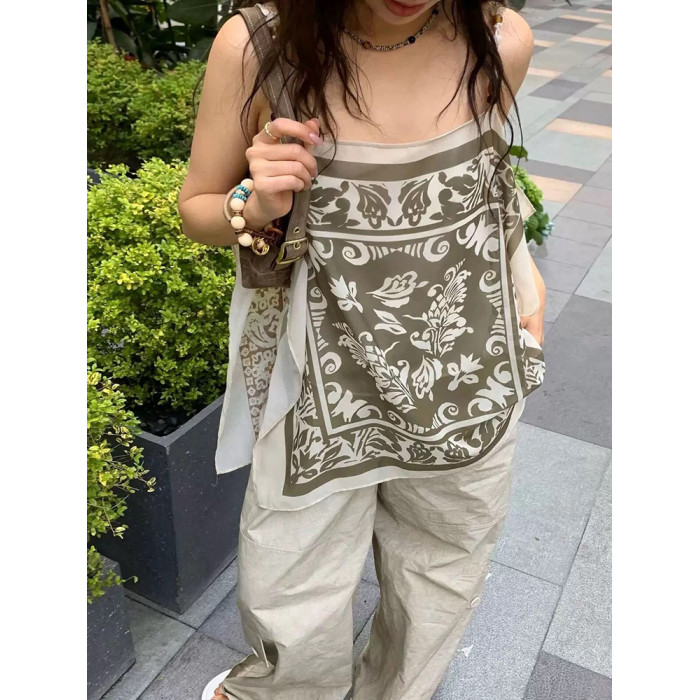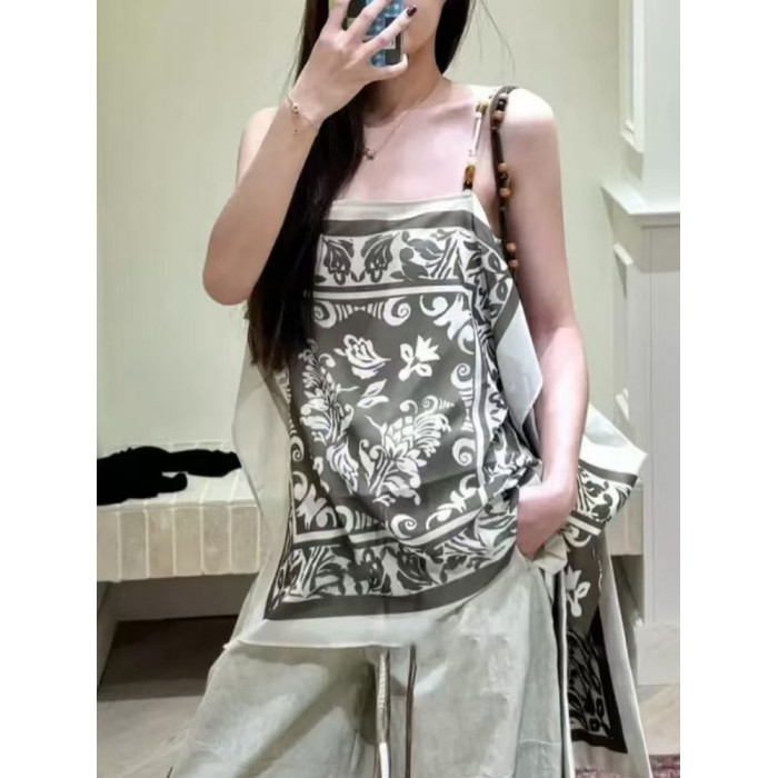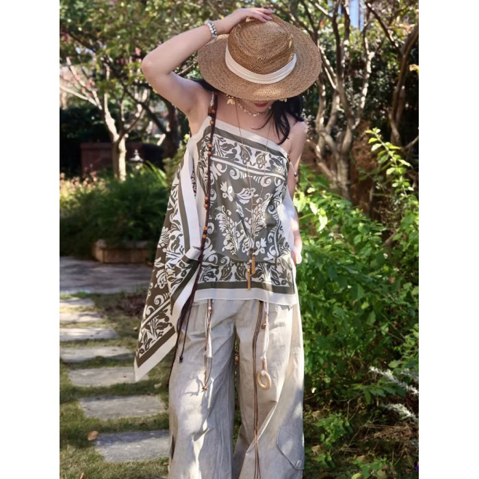 25春夏新款平口藝術印花串珠吊帶衫波西米亞度假風設計感背心上衣