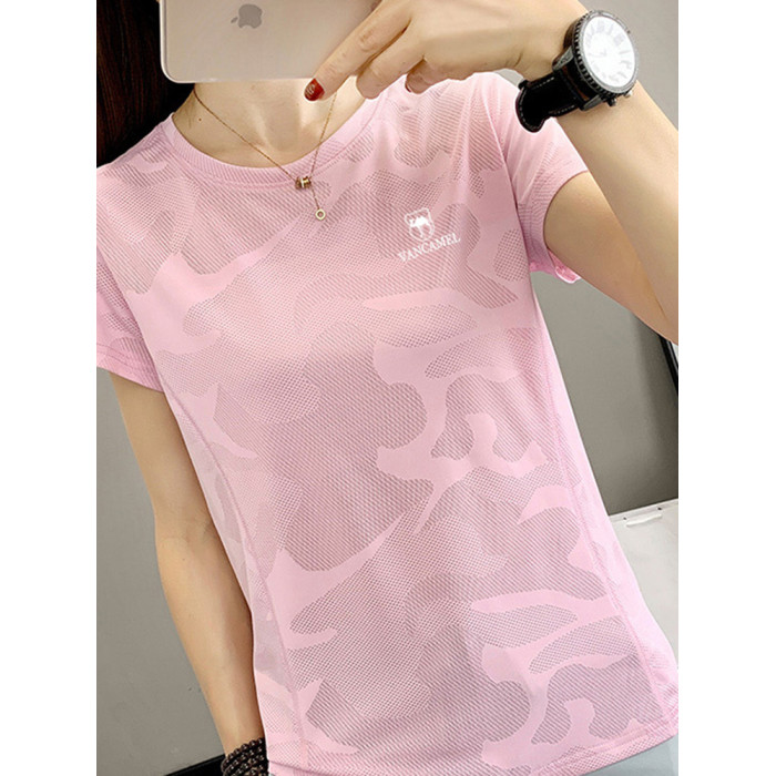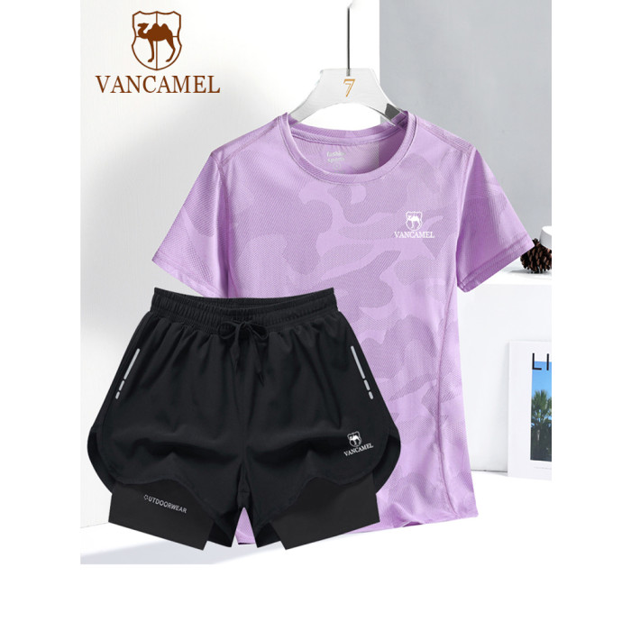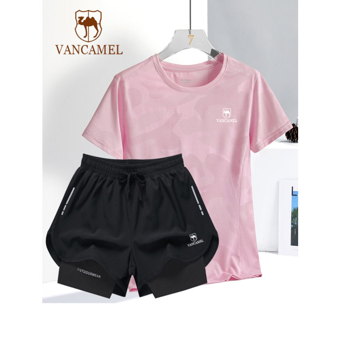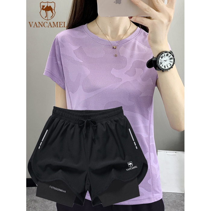 西域駱駝冰絲運動套裝女t恤短袖短褲透氣跑步休閒圓領速乾衣排汗