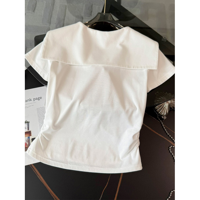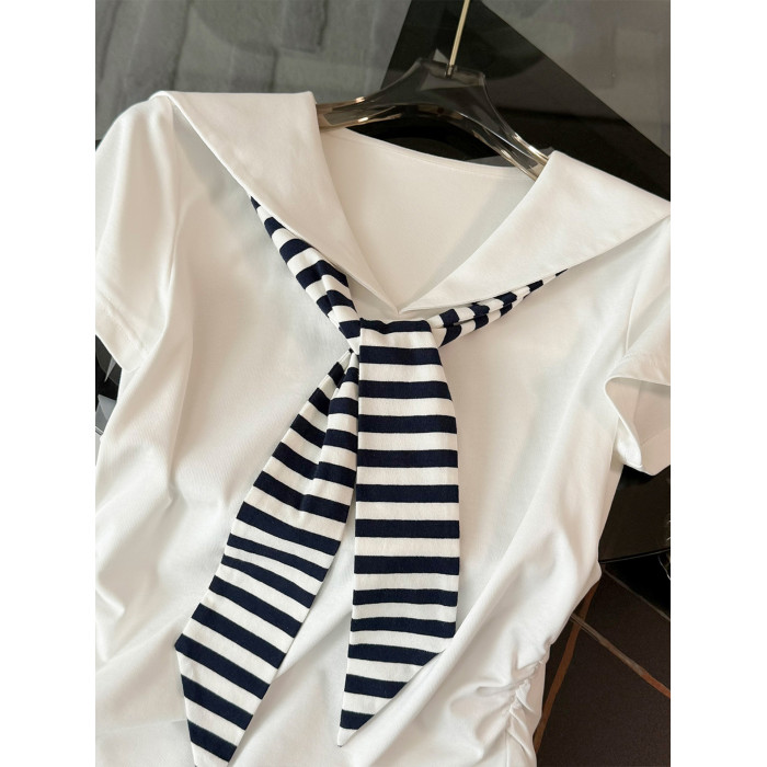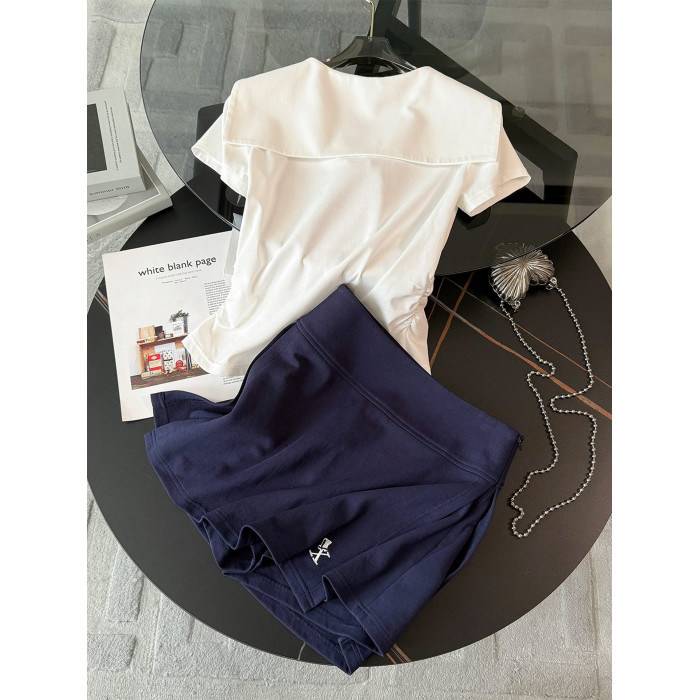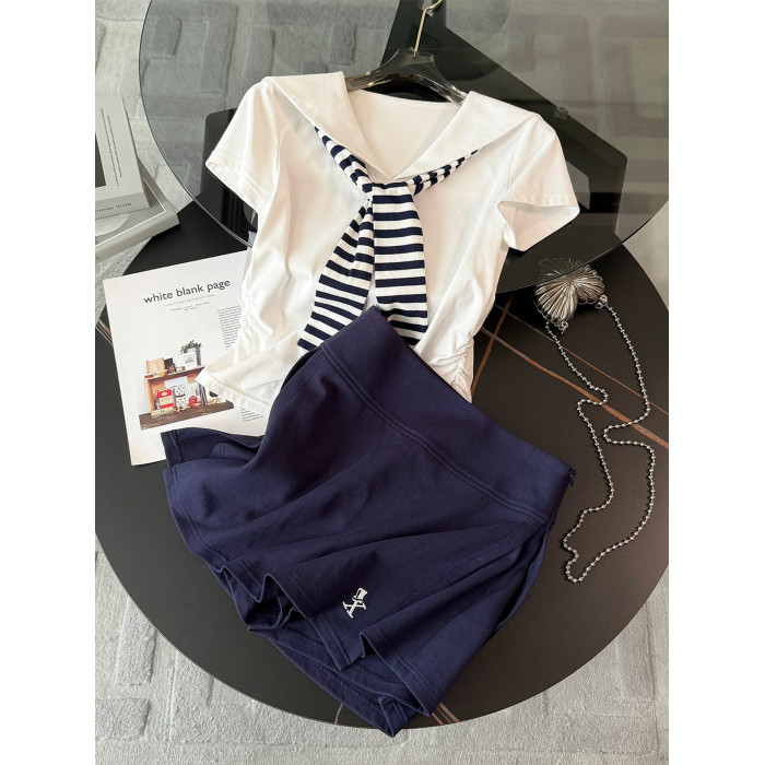 時尚運動套裝裙女夏新款俏皮可愛蝴蝶結海軍領短袖上衣褲裙兩件套