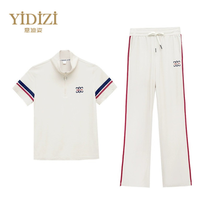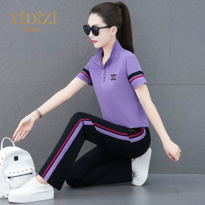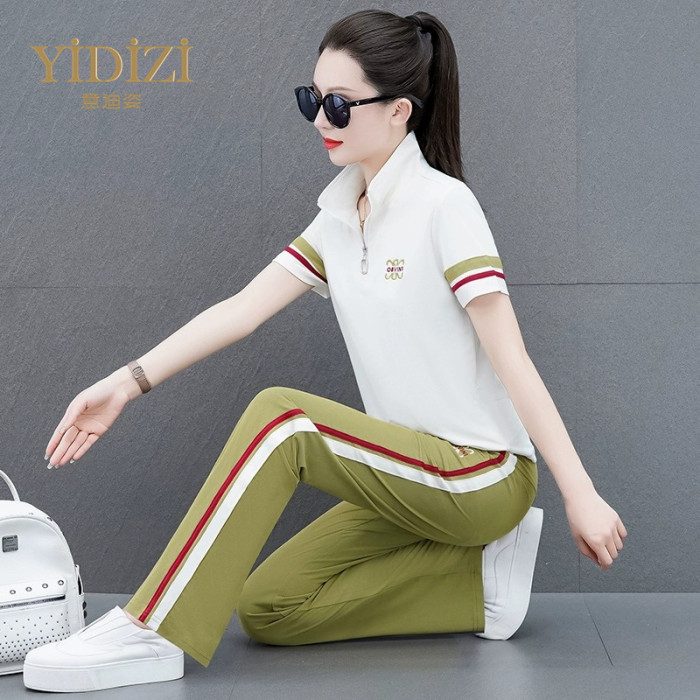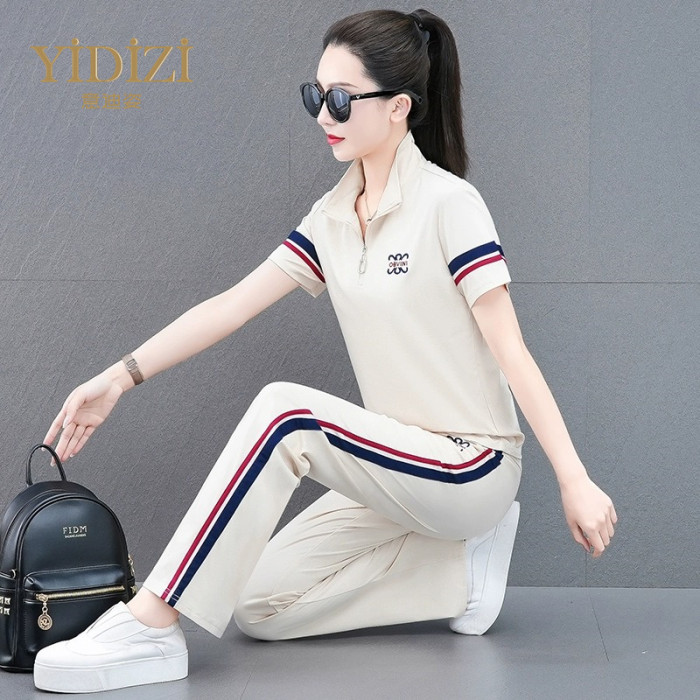時尚減齡休閒運動套裝女夏2025新款刺綉冰絲薄款短袖跑步服兩件套