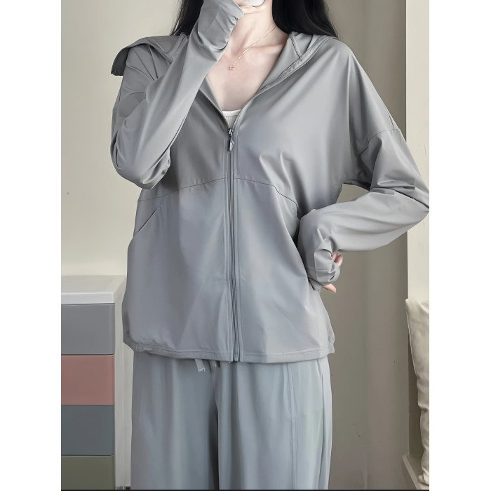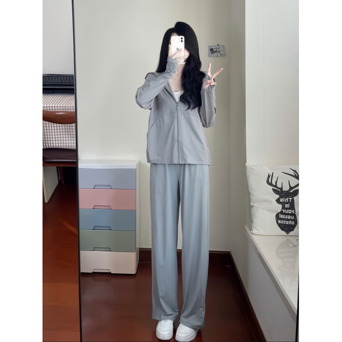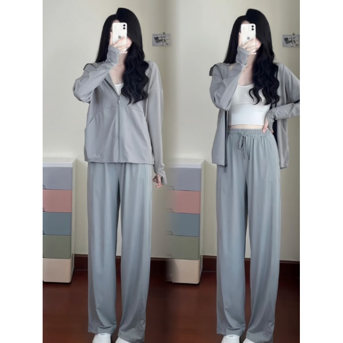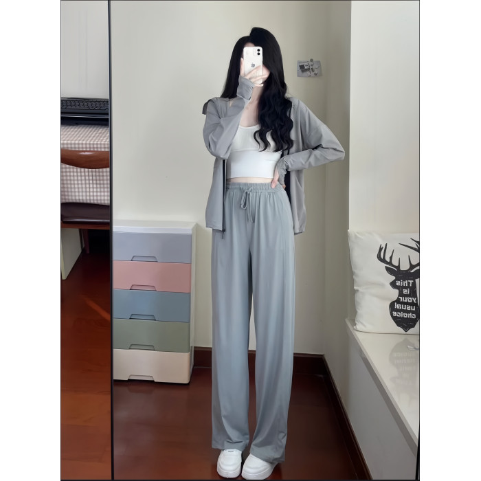 冰絲防曬衣休閒運動套裝女夏季輕薄透氣防紫外線時尚濶腿褲兩件套
