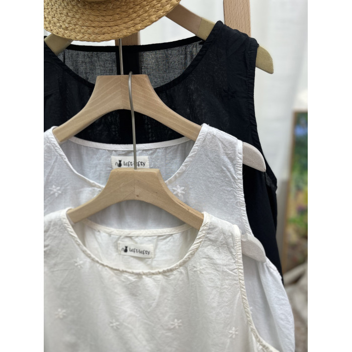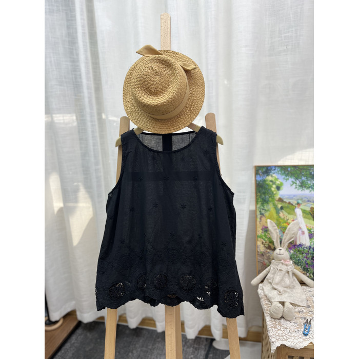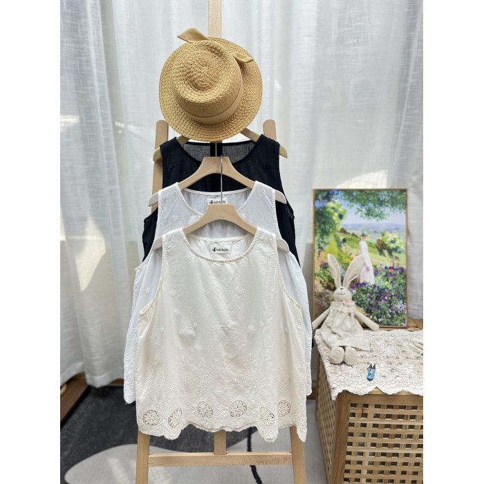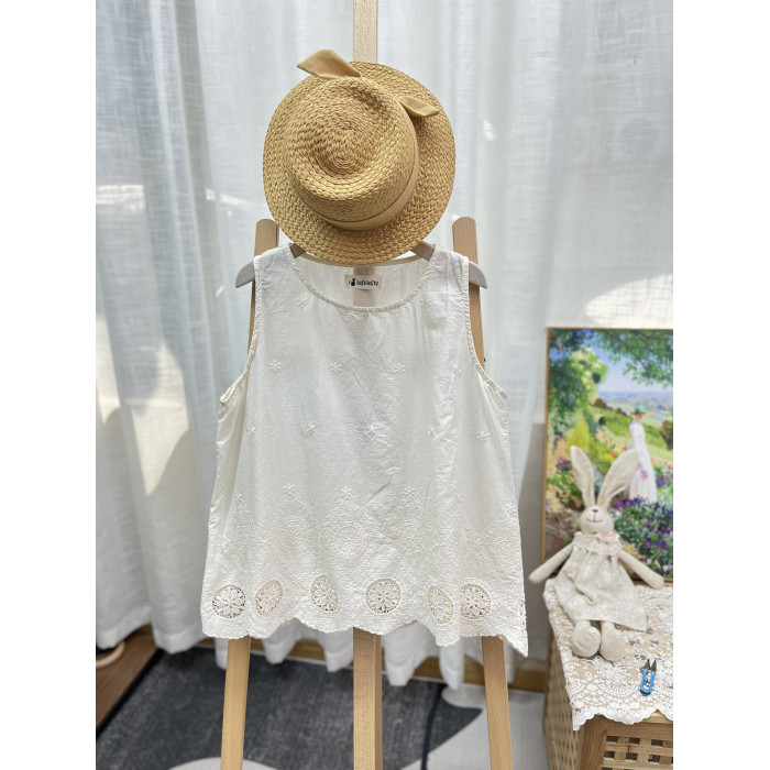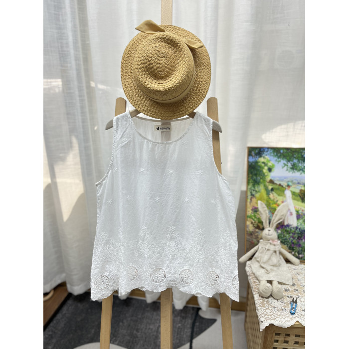 夏季新款文藝刺綉花邊圓領純棉無袖打底衫寬松內搭吊帶衫娃娃衫女