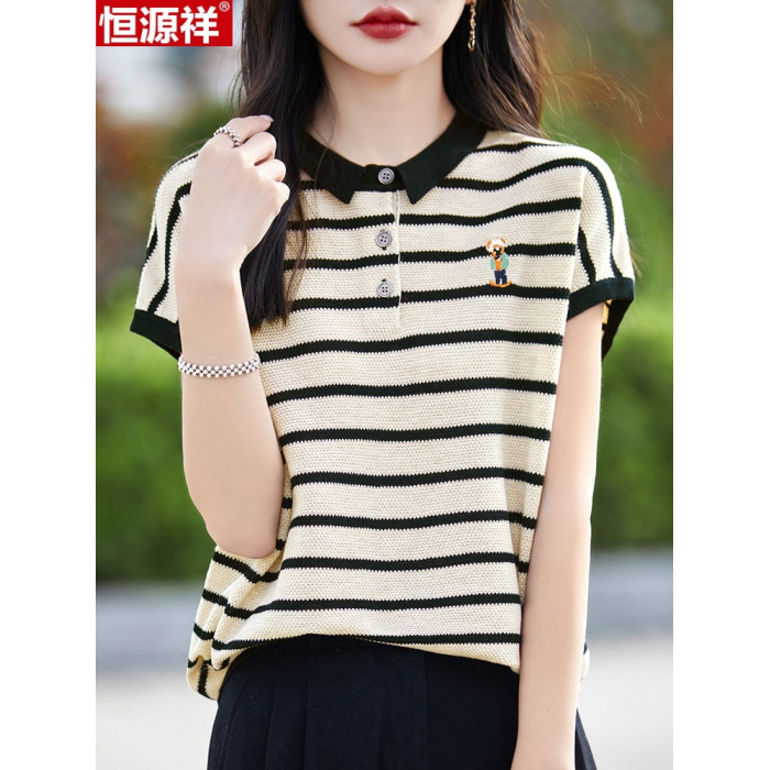 恒源祥桑蠶絲短袖女T恤夏季新款寬松翻領針織衫上衣條紋短袖小衫