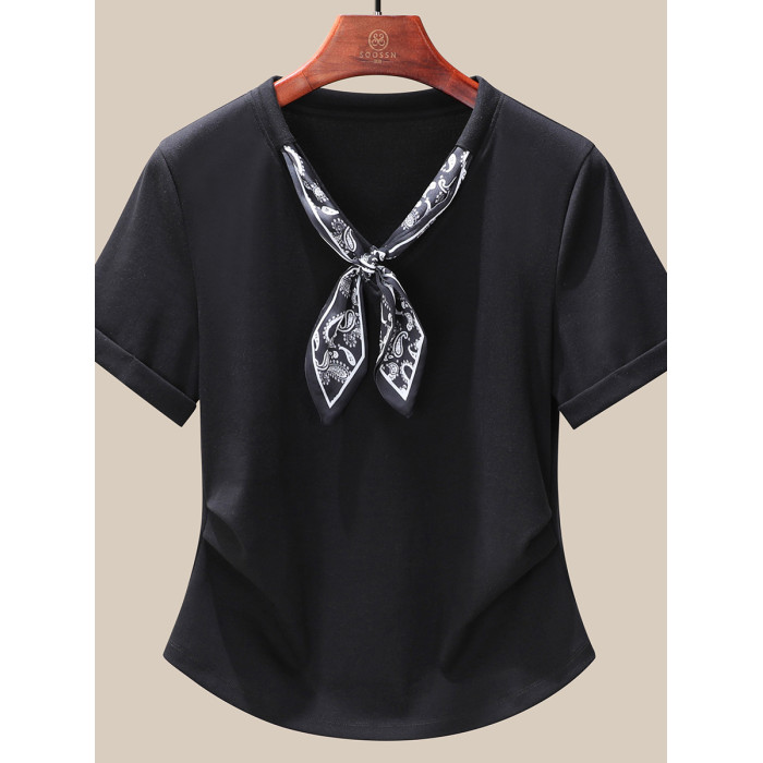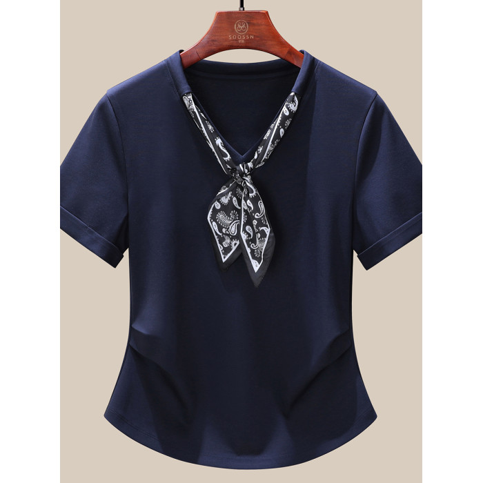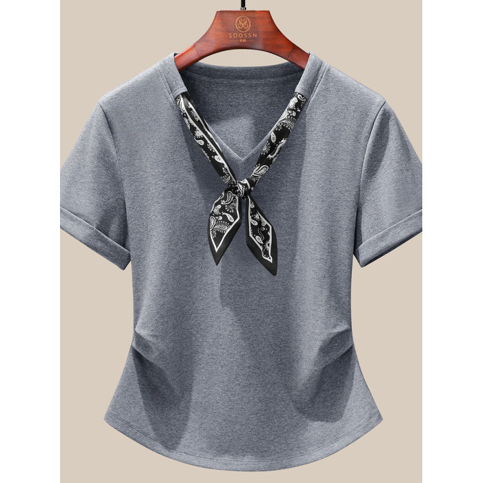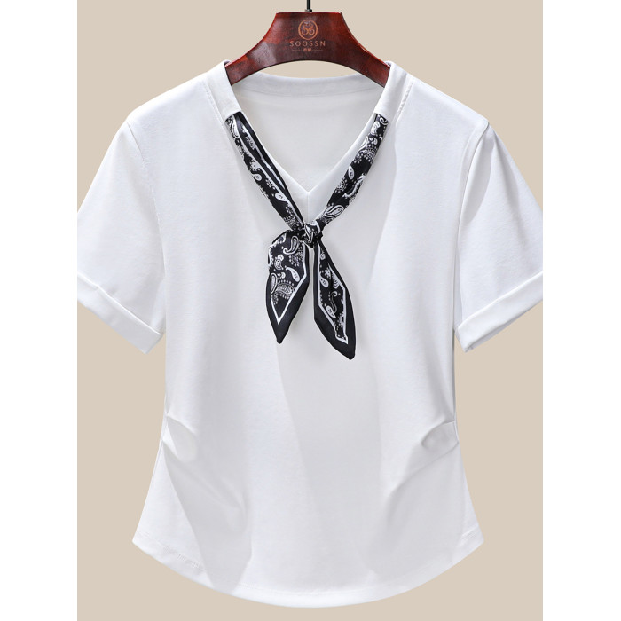 哥弟堡尼V領短袖女t恤2025新款夏季絲巾設計感小衆南油上衣