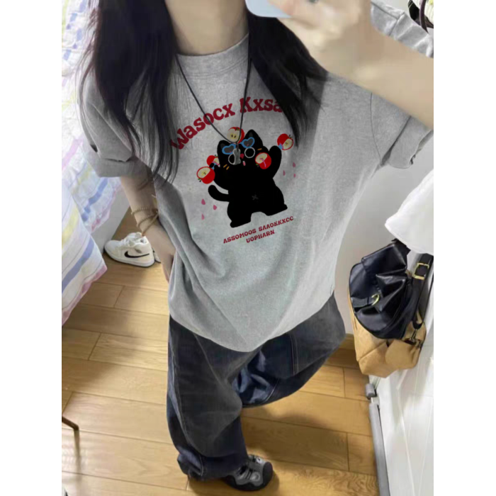 灰色純棉短袖女t恤2025新款夏季設計感小衆美式寬松半袖圓領上衣