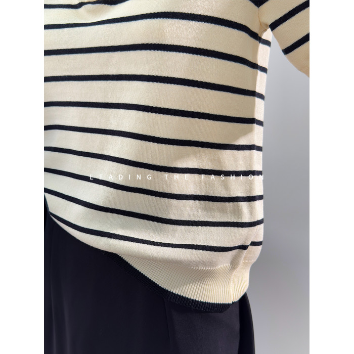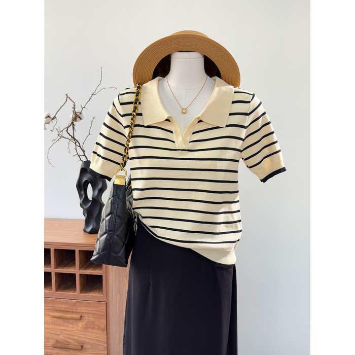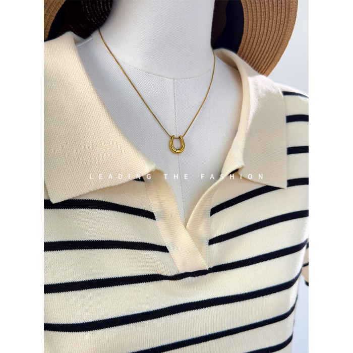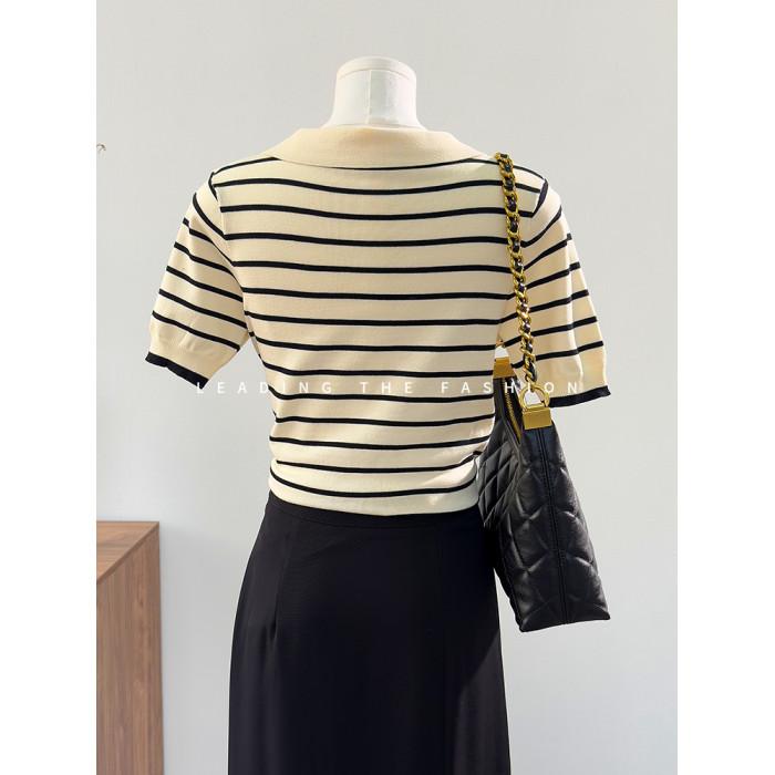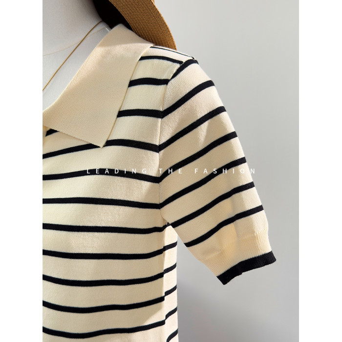翻領冰絲條紋polo衫針織短袖t恤女夏正肩v領上衣夏季上班族穿搭