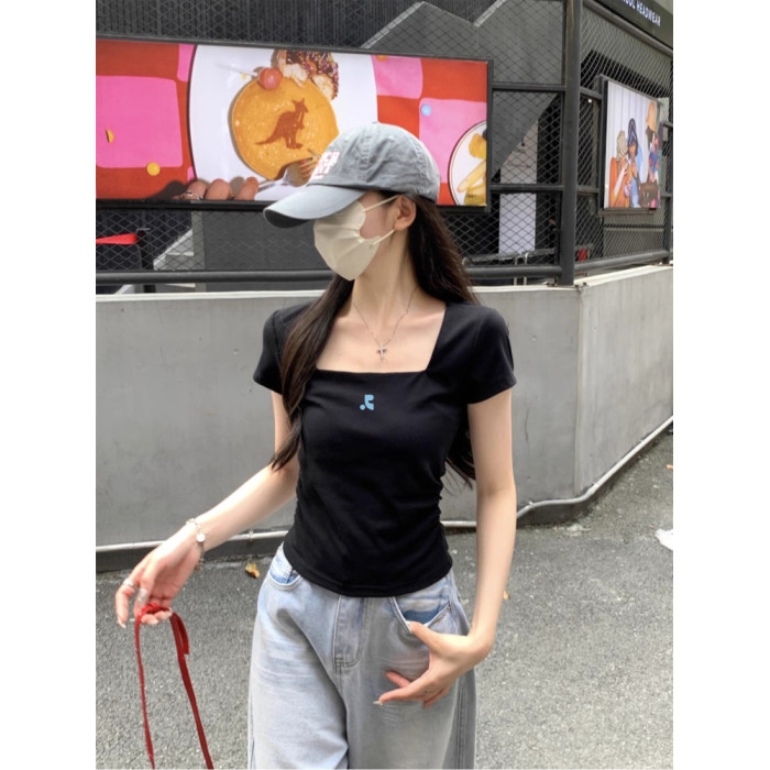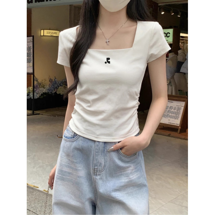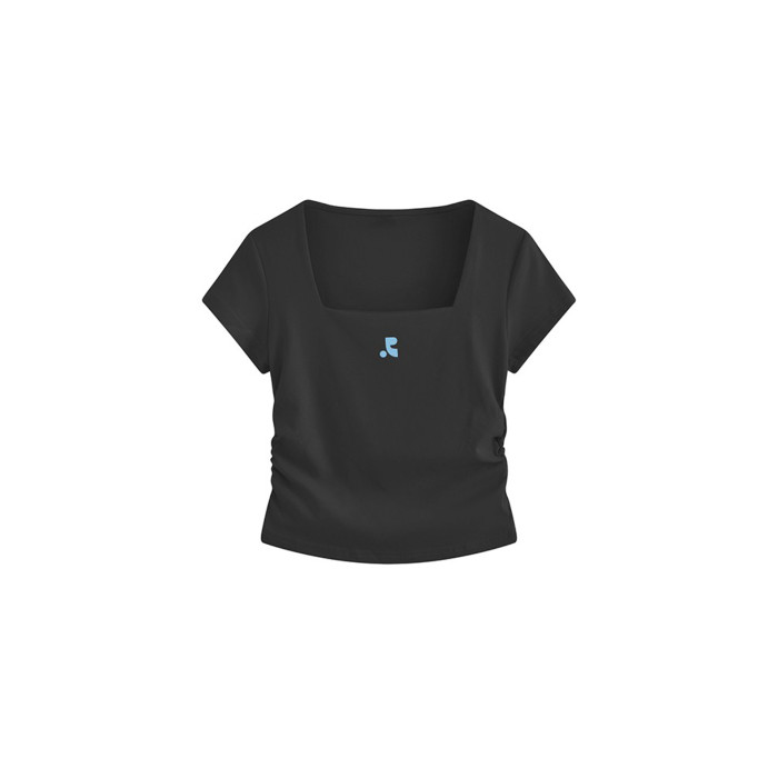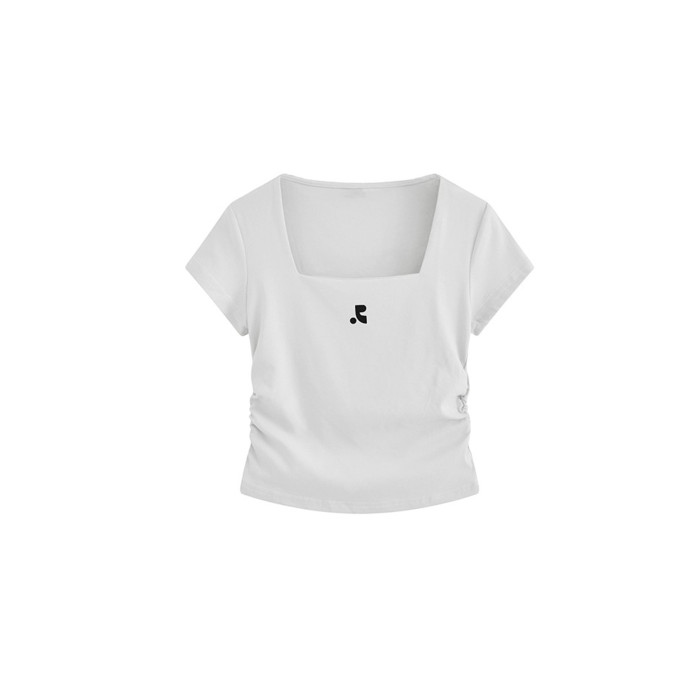 restandrecreation韓版小個子方領露鎖骨短袖女t恤褶皺RR修身上衣