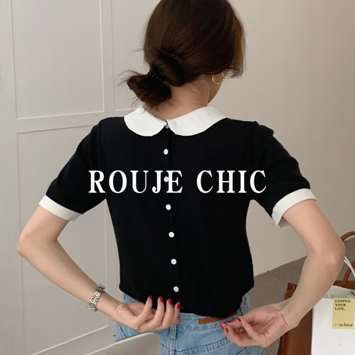法國Rouje Chic夏季洋氣拼色娃娃領單排釦設計感短袖針織衫女t恤