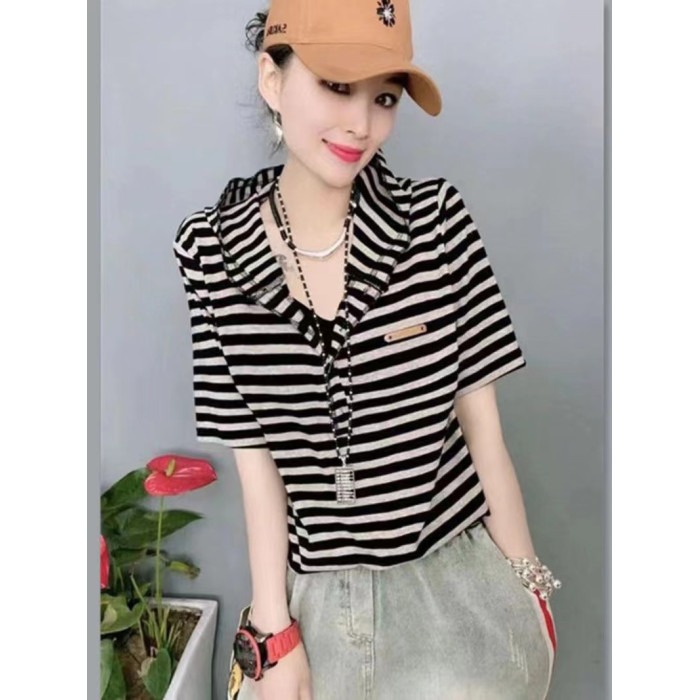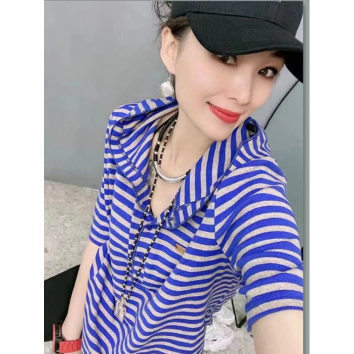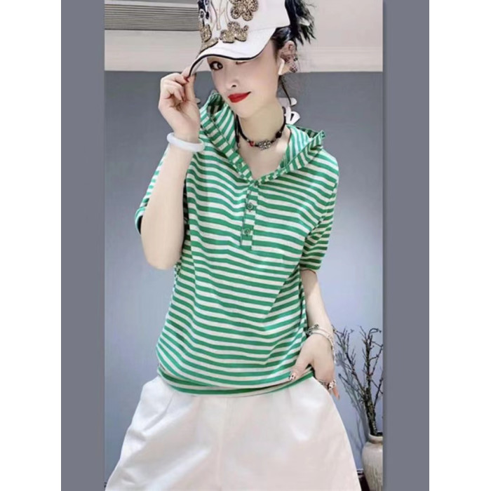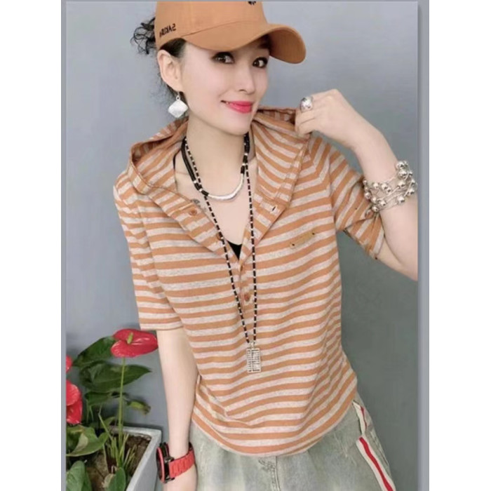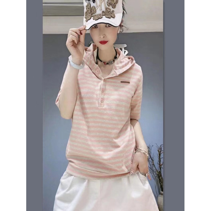 歐洲站純棉復古彈力2025夏季寬松時尚個性條紋連帽短袖女T恤上衣