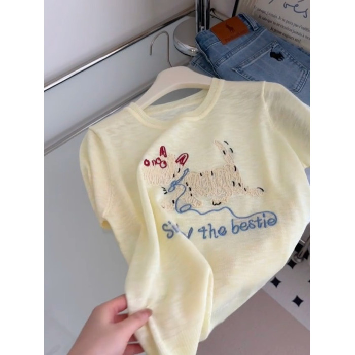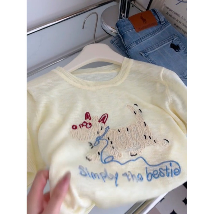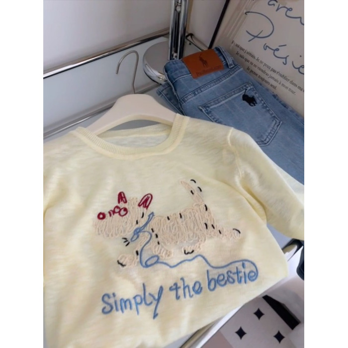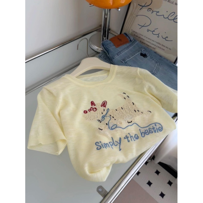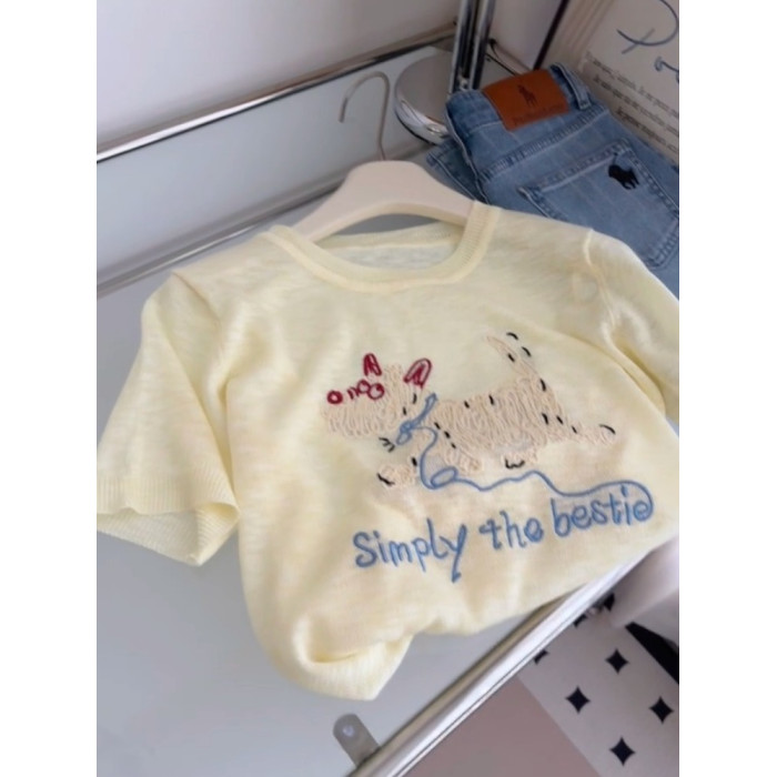 夏日ootd穿搭黃色小狗上衣設計感法式溫柔漂亮薄款短袖正肩女T恤