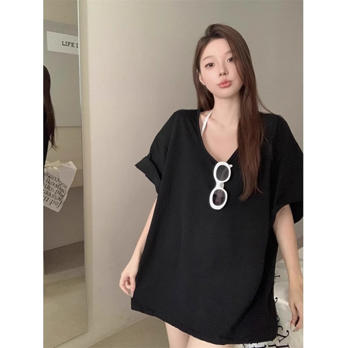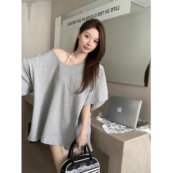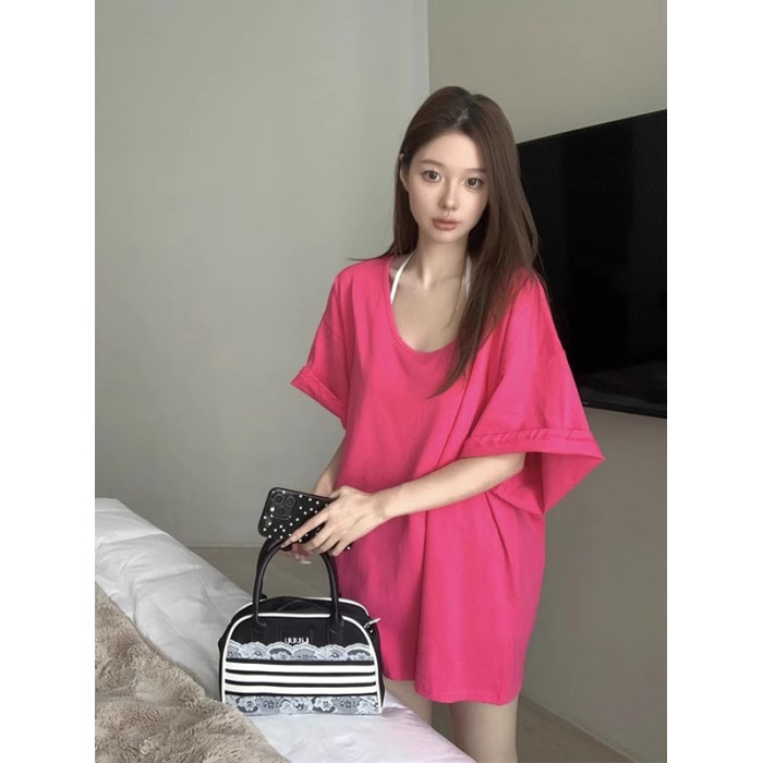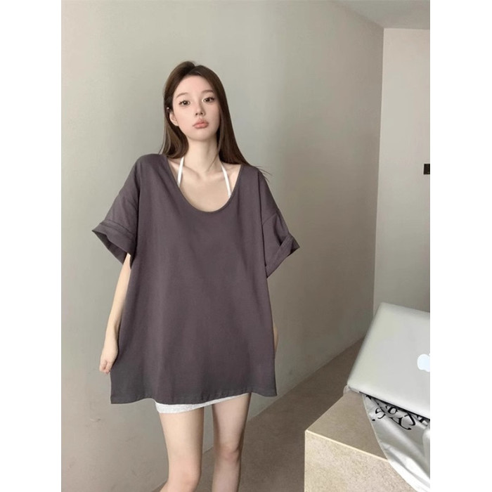 多巴胺U領短袖女t恤2025新款夏季寬松慵懶風中長款夏日漂亮小上衣