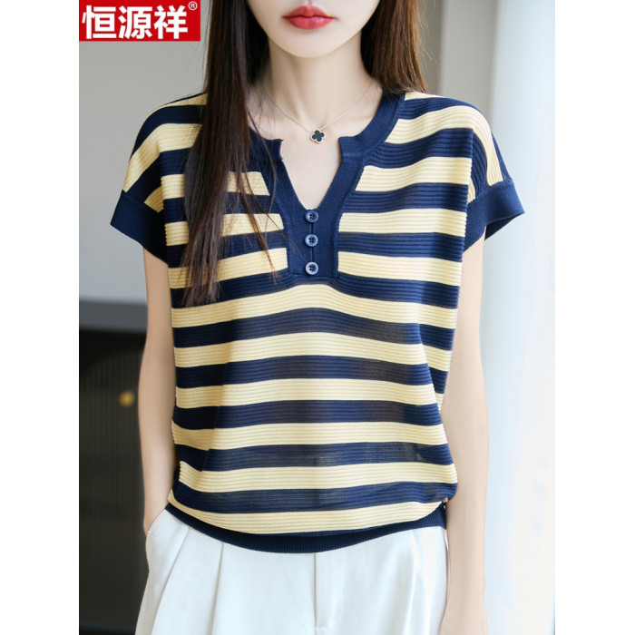 恒源祥純桑蠶絲短袖女T恤夏季新款寬松V領針織衫上衣條紋百搭真絲