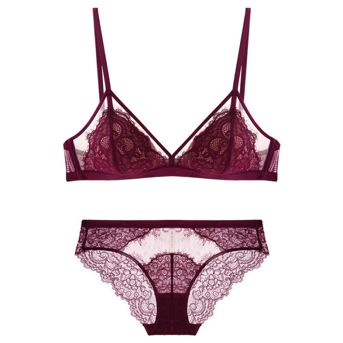 法式蕾絲無鋼圈文胸內衣夏季薄款女套裝小胸不空杯聚攏三角杯胸罩