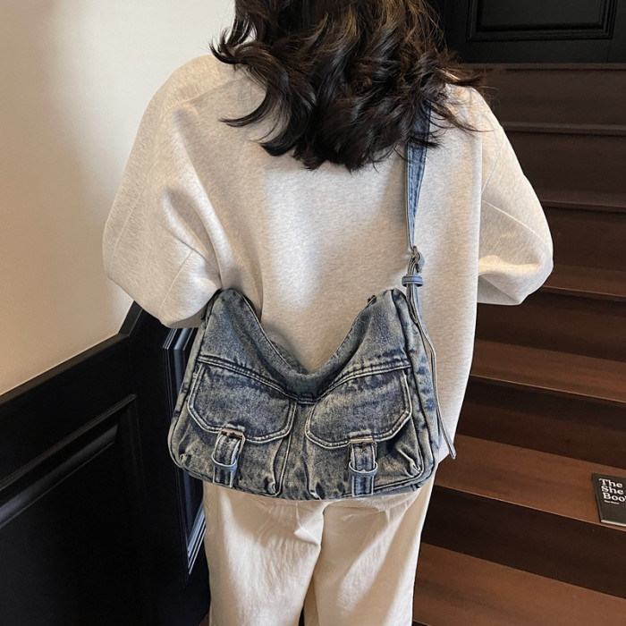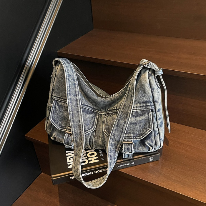 高級小衆多口袋夏季牛仔韓國機車挎復古包包女斜感新款2025托特包