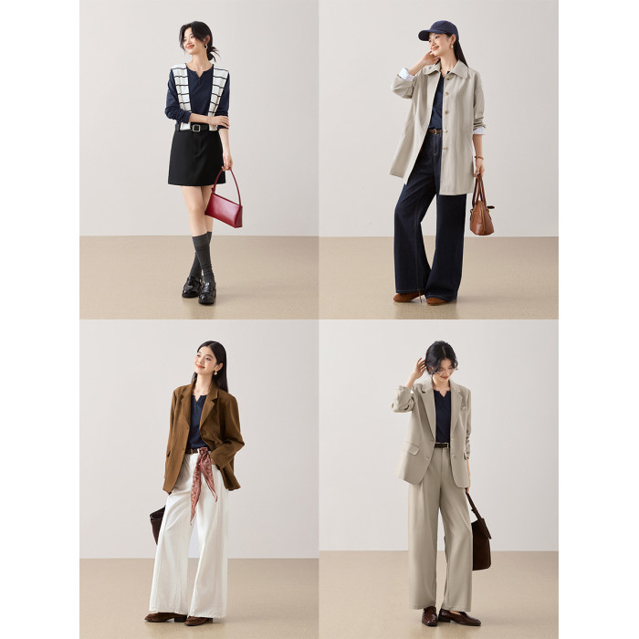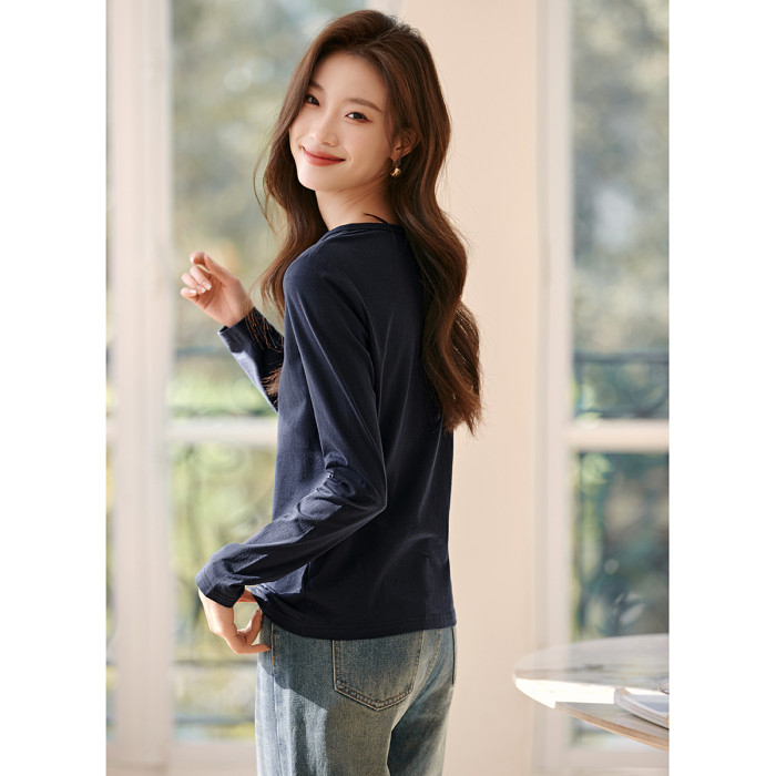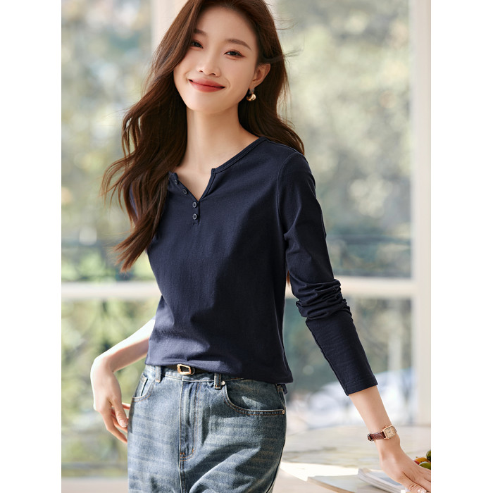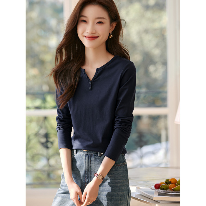沫晗依美V領紐釦裝飾長袖女T恤2025年春夏新款休閒百搭長袖女T恤