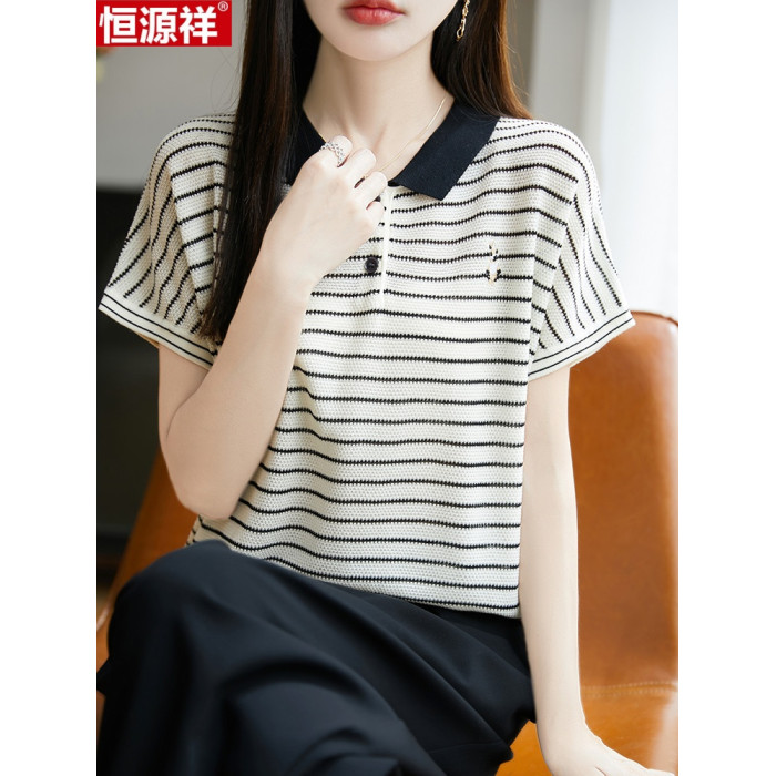 恒源祥桑蠶絲短袖女T恤夏季新款寬松翻領針織衫上衣條紋拼色真絲