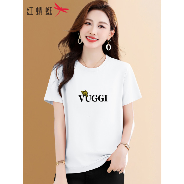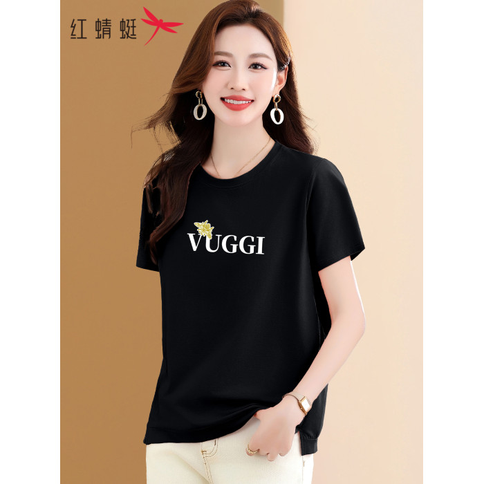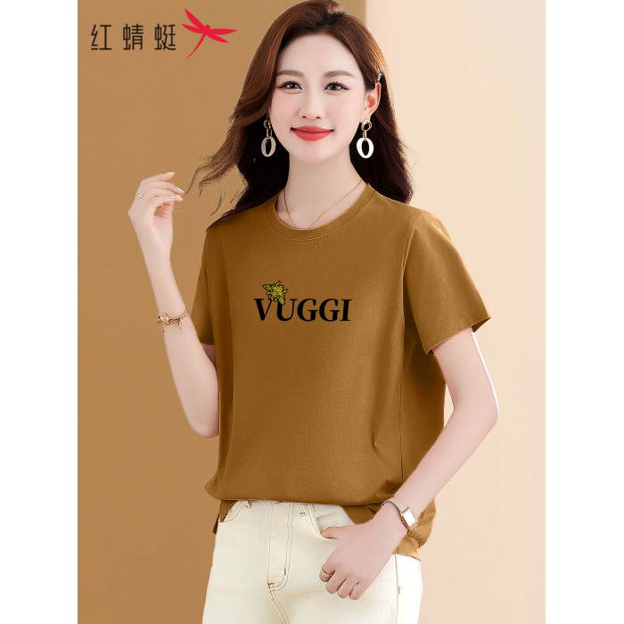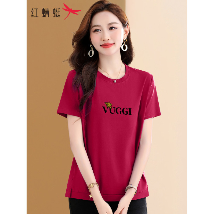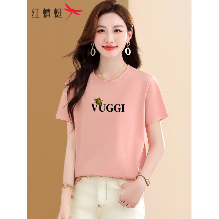 紅蜻蜓正肩短袖女t恤2025夏季新款中年媽媽漂亮減齡粉色純棉上衣