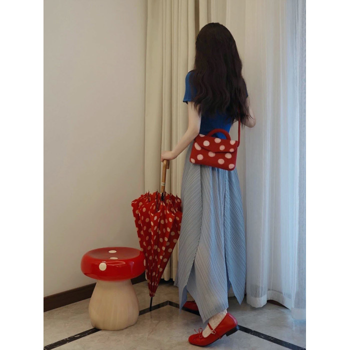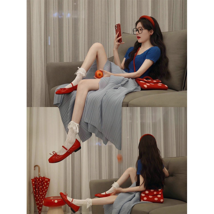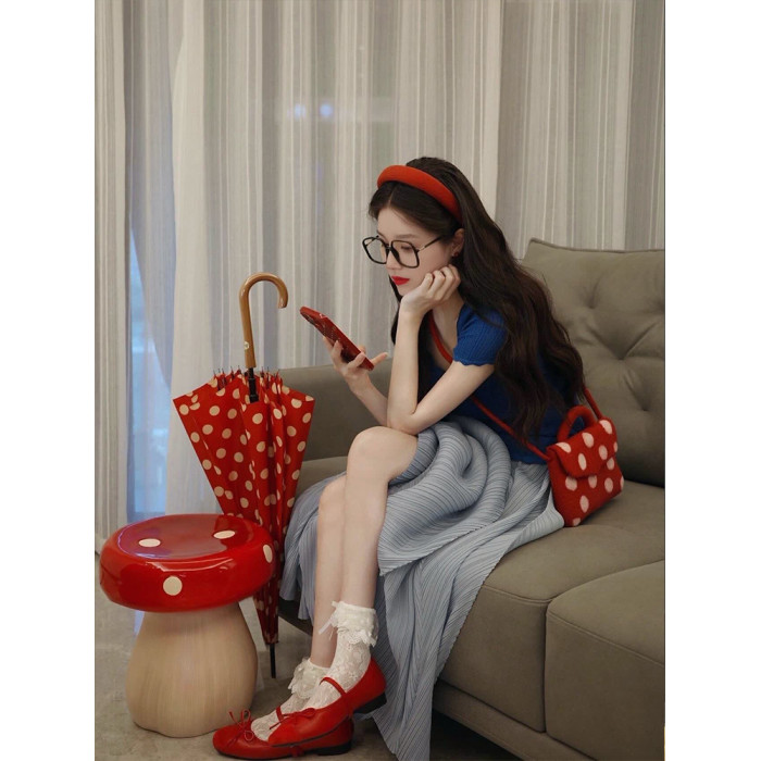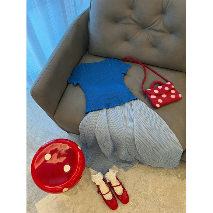 三宅褶皺裙短袖女T恤夏季套裝法式高腰顯瘦藍色花苞半身裙兩件套