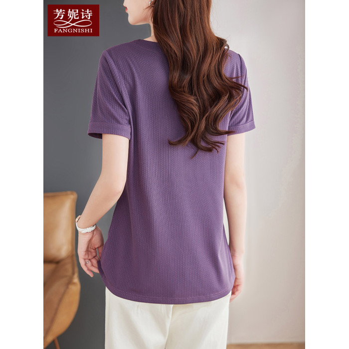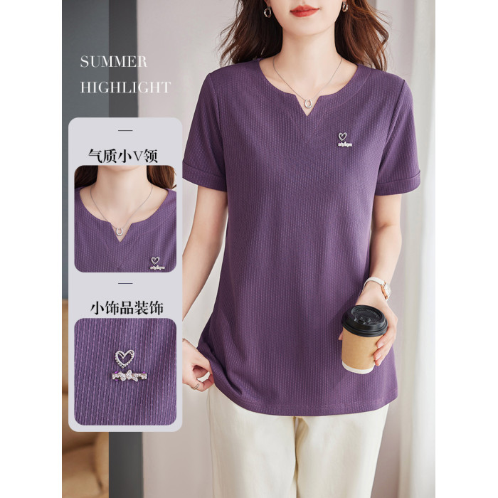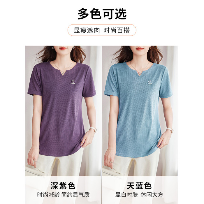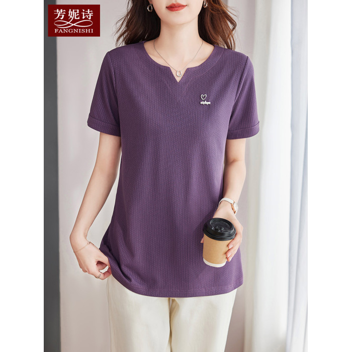 v領短袖女t恤2025新款媽媽夏裝大碼寬松顯瘦半袖上衣中長款體恤衫