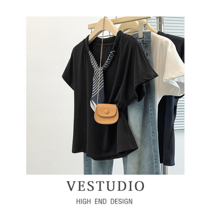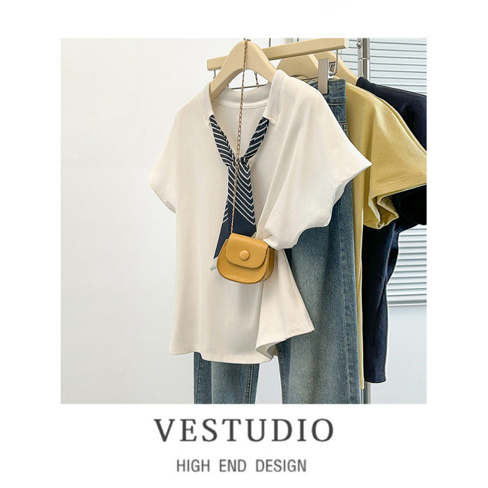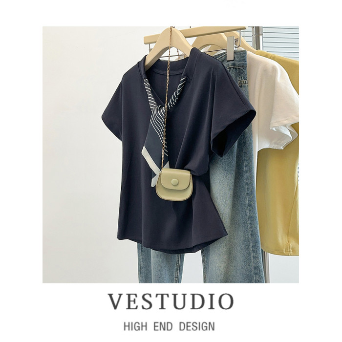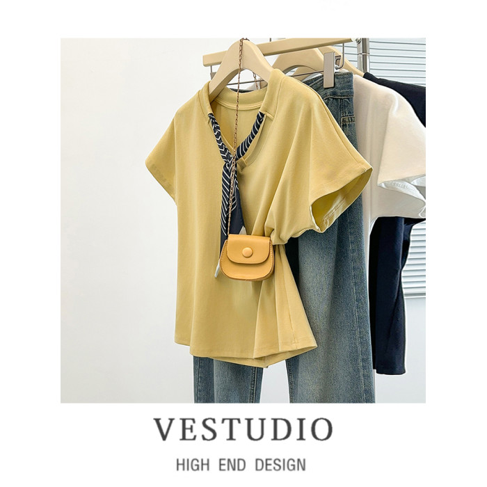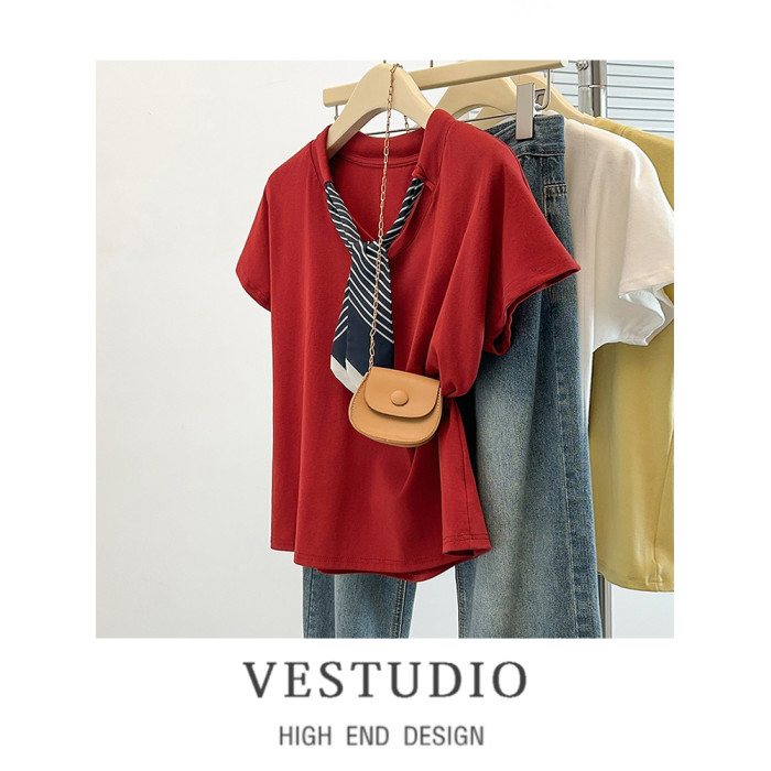 品牌折釦夏季正肩V領氣質甜美上衣胖mm大碼領帶顯瘦遮肉短袖女T恤