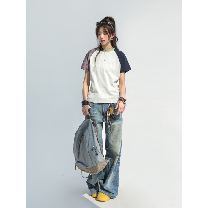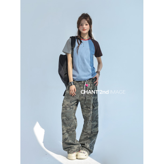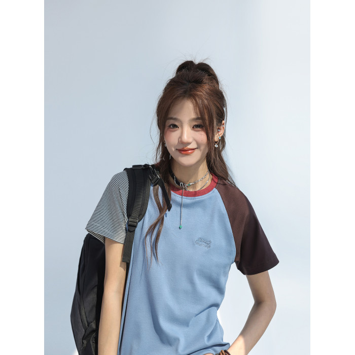 「CHANT2nd」撞色拼接條紋短袖女t恤夏蝴蝶結刺綉上衣設計感小衆