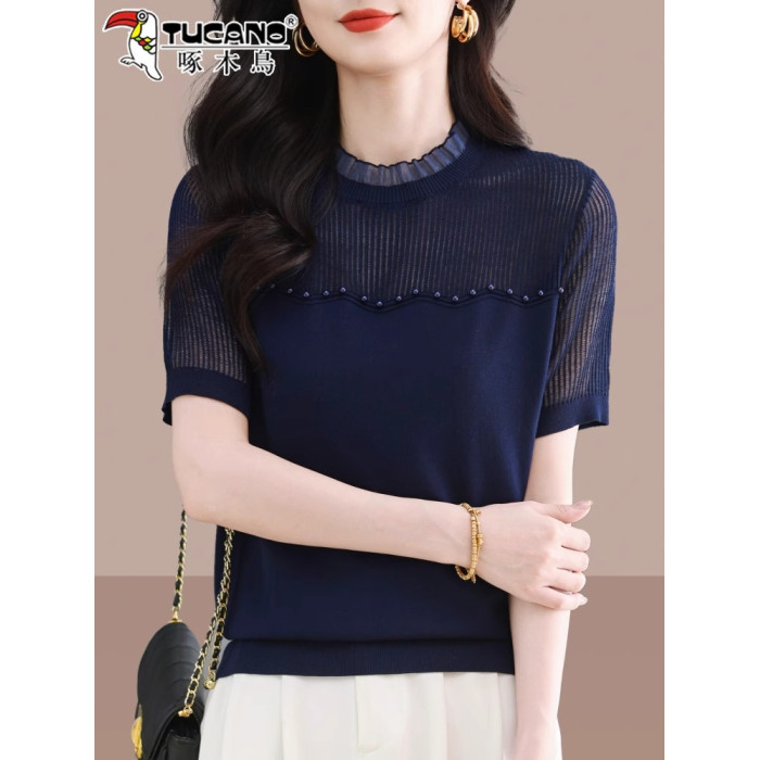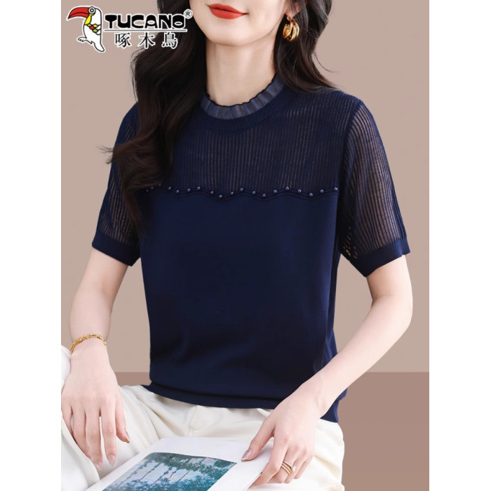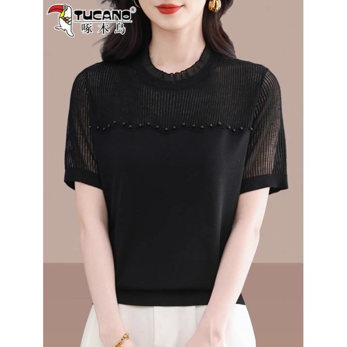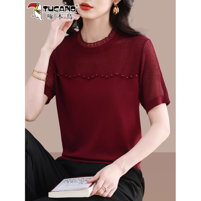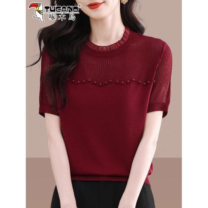 啄木鳥酒紅色短袖女t恤2025新款夏季媽媽裝時髦半袖蕾絲針織上衣