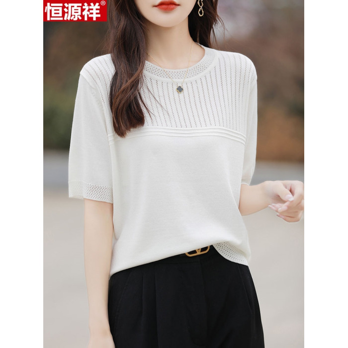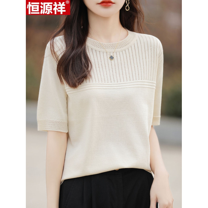 恒源祥桑蠶絲短袖女T恤夏季新款寬松顯瘦圓領針織衫上衣短袖小衫