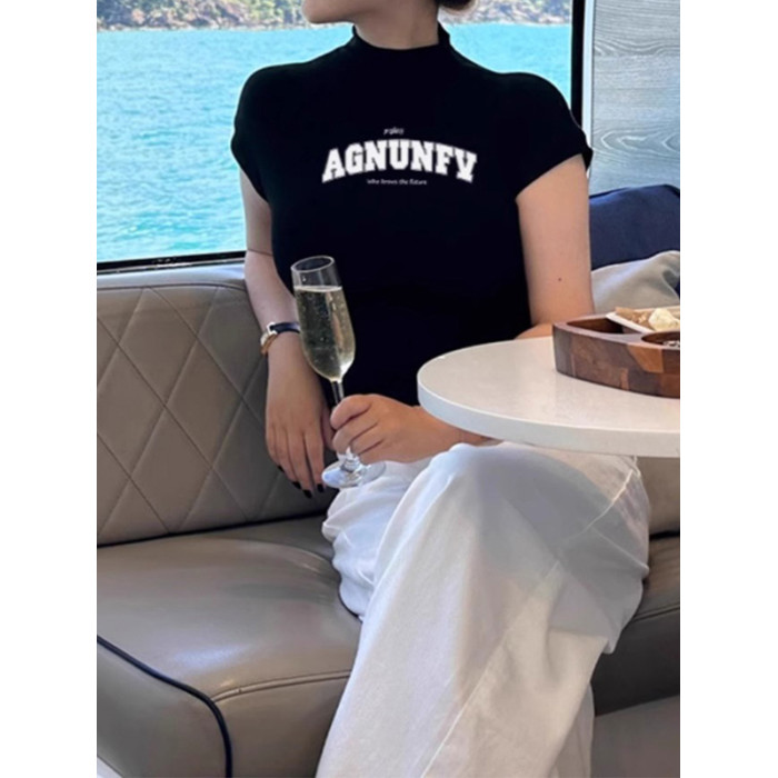 純棉短袖女T恤夏季2025新款內搭打底衫修身黑色半高領體恤上衣ins