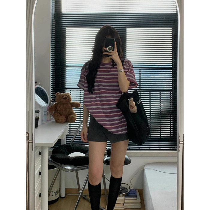 港風復古穿搭撞色條紋短袖女T恤2025新款夏季寬松百搭休閒上衣ins
